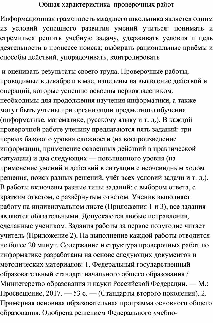 и оценивать результаты своего труда. Проверочные работы, проводимые в декабре и в мае, нацелены на выявление действий и операций, которые успешно освоены первоклассником, необходимы для продолжения изучения информатики, а также могут быть учтены при организации предметного обучения (информатике, математике, русскому языку и т. д.). В каждой проверочной работе ученику предлагаются пять заданий: три первых базового уровня сложности (на воспроизведение информации, применение освоенных действий в практической ситуации) и два следующих — повышенного уровня (на применение умений и действий в ситуации с неочевидным ходом решения, поиск разных решений, учёт всех условий задачи и т. д.). В работы включены разные типы заданий: с выбором ответа, с кратким ответом, с развёрнутым ответом. Ученик выполняет работу на индивидуальном листе (Приложения 1 и 3), все задания являются обязательными. Допускаются любые исправления, сделанные учеником. Задания работы за первое полугодие читает учитель (Приложение 2). На выполнение каждой работы отводится не более 20 минут. Содержание и структура проверочных работ по информатике разработаны на основе следующих документов и методических материалов: 1. Федеральный государственный образовательный стандарт начального общего образования / Министерство образования и науки Российской Федерации. — М.: Просвещение, 2017. — 53 с. — (Стандарты второго поколения). 2. Примерная основная образовательная программа основного общего образования. Одобрена решением Федерального учебно-методического объединения по общему образованию. Протокол от 8 апреля 2015 г. № 1/15.
