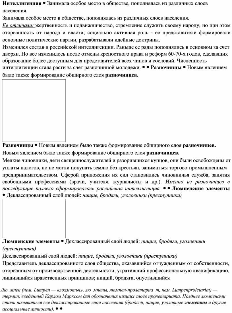 Занимала особое место в обществе, пополнялась из различных слоев населения. Ее отличали: жертвенность и подвижничество, стремление служить своему народу, но при этом оторванность от народа и власти; социально активная роль - ее представители формировали основные политические партии, разрабатывали идейные доктрины. Изменился состав и российской интеллигенции. Раньше ее ряды пополнялись в основном за счет дворян. Но все изменилось после отмены крепостного права и реформ 60-70-х годов, сделавших образование более доступным для представителей всех чинов и сословий. Численность интеллигенции стала расти за счет разночинной молодежи. |