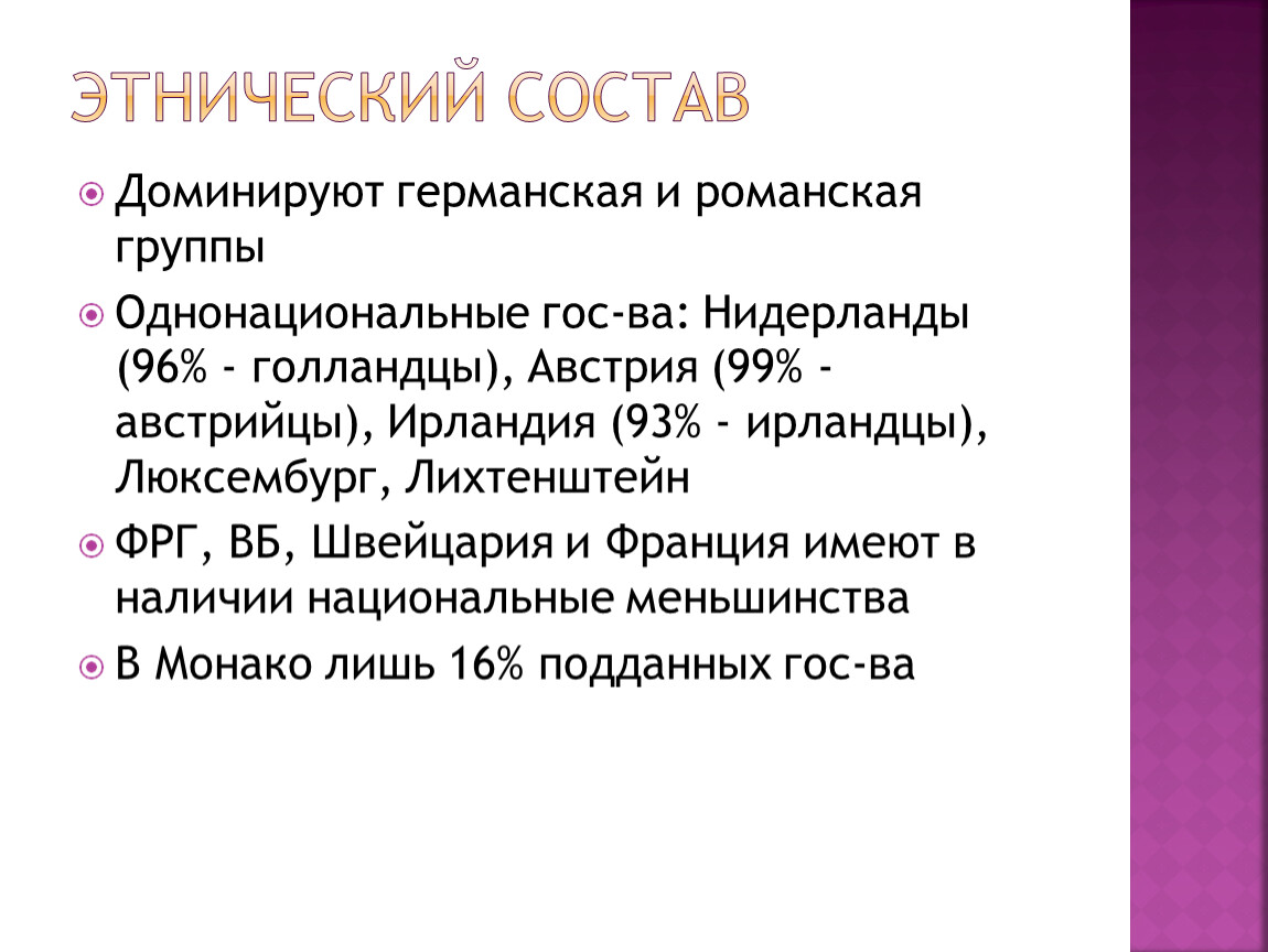 Однонациональные гос-ва: Нидерланды (96% - голландцы), Австрия (99% - австрийцы), Ирландия (93% - ирландцы), Люксембург, Лихтенштейн