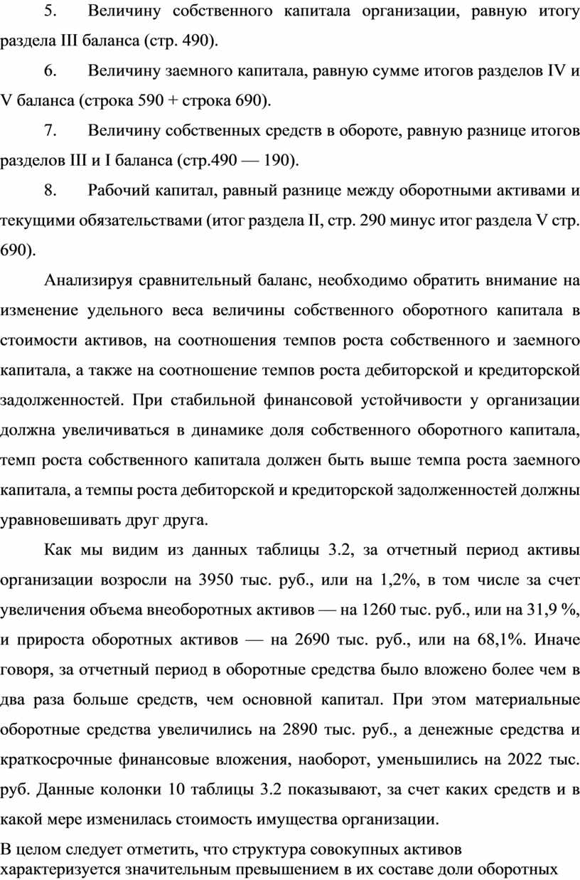 Анализируя сравнительный баланс, необходимо обратить внимание на изменение удельного веса величины собственного оборотного капитала в стоимости активов, на соотношения темпов роста собственного и заемного капитала, а также на соотношение темпов роста дебиторской и кредиторской задолженностей. При стабильной финансовой устойчивости у организации должна увеличиваться в динамике доля собственного оборотного капитала, темп роста собственного капитала должен быть выше темпа роста заемного капитала, а темпы роста дебиторской и кредиторской задолженностей должны уравновешивать друг друга.