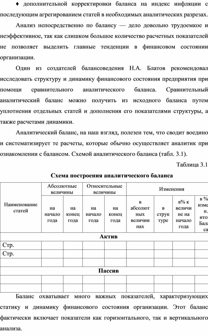 Аналитический баланс, на наш взгляд, полезен тем, что сводит воедино и систематизирует те расчеты, которые обычно осуществляет аналитик при ознакомлении с балансом. Схемой аналитического баланса (табл. 3.1).