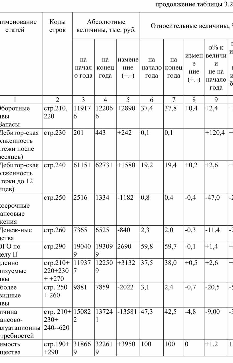 Как мы видим из данных таблицы 3.2, за отчетный период активы организации возросли на 3950 тыс. руб., или на 1,2%, в том числе за счет увеличения объема внеоборотных активов — на 1260 тыс. руб., или на 31,9 %, и прироста оборотных активов — на 2690 тыс. руб., или на 68,1%. Иначе говоря, за отчетный период в оборотные средства было вложено более чем в два раза больше средств, чем основной капитал. При этом материальные оборотные средства увеличились на 2890 тыс. руб., а денежные средства и краткосрочные финансовые вложения, наоборот, уменьшились на 2022 тыс. руб. Данные колонки 10 таблицы 3.2 показывают, за счет каких средств и в какой мере изменилась стоимость имущества организации.