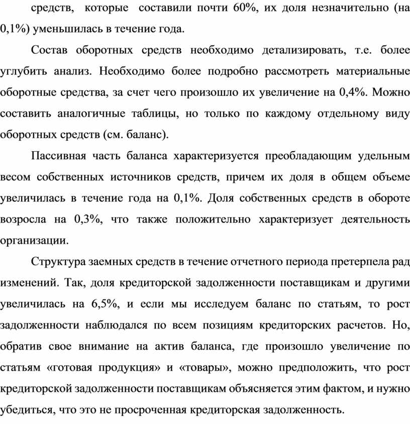 Состав оборотных средств необходимо детализировать, т.е. более углубить анализ. Необходимо более подробно рассмотреть материальные оборотные средства, за счет чего произошло их увеличение на 0,4%. Можно составить аналогичные таблицы, но только по каждому отдельному виду оборотных средств (см. баланс).