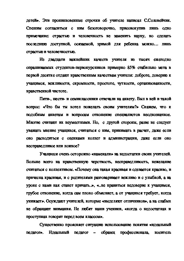 детям и в достоинствах своих, и в пороках, нескованный – распахнутый длядетей». Эти проникновенные строчки об учителе написал С.Соловейчик.