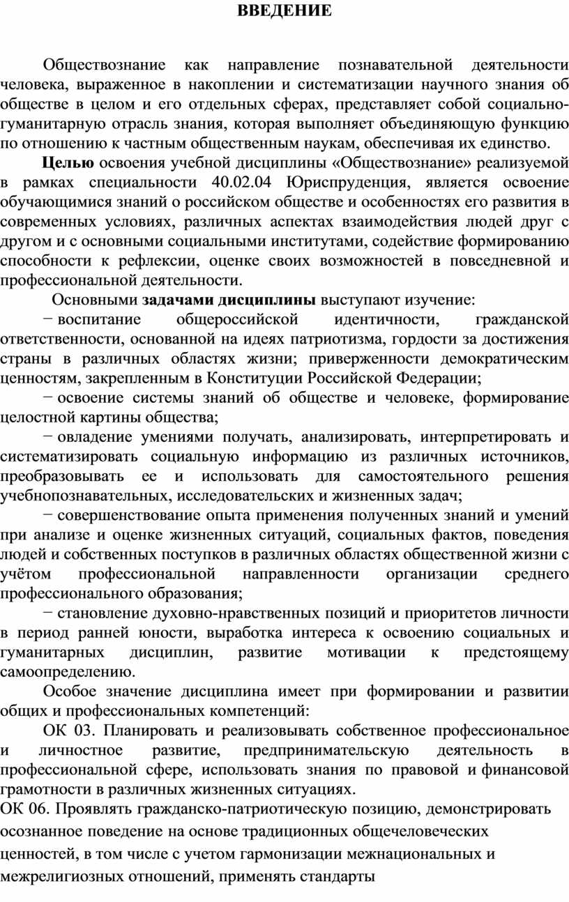 Целью освоения учебной дисциплины «Обществознание» реализуемой в рамках специальности 40.02.04 Юриспруденция, является освоение обучающимися знаний о российском обществе и особенностях его развития в современных условиях, различных аспектах взаимодействия людей друг с другом и с основными социальными институтами, содействие формированию способности к рефлексии, оценке своих возможностей в повседневной и профессиональной деятельности.