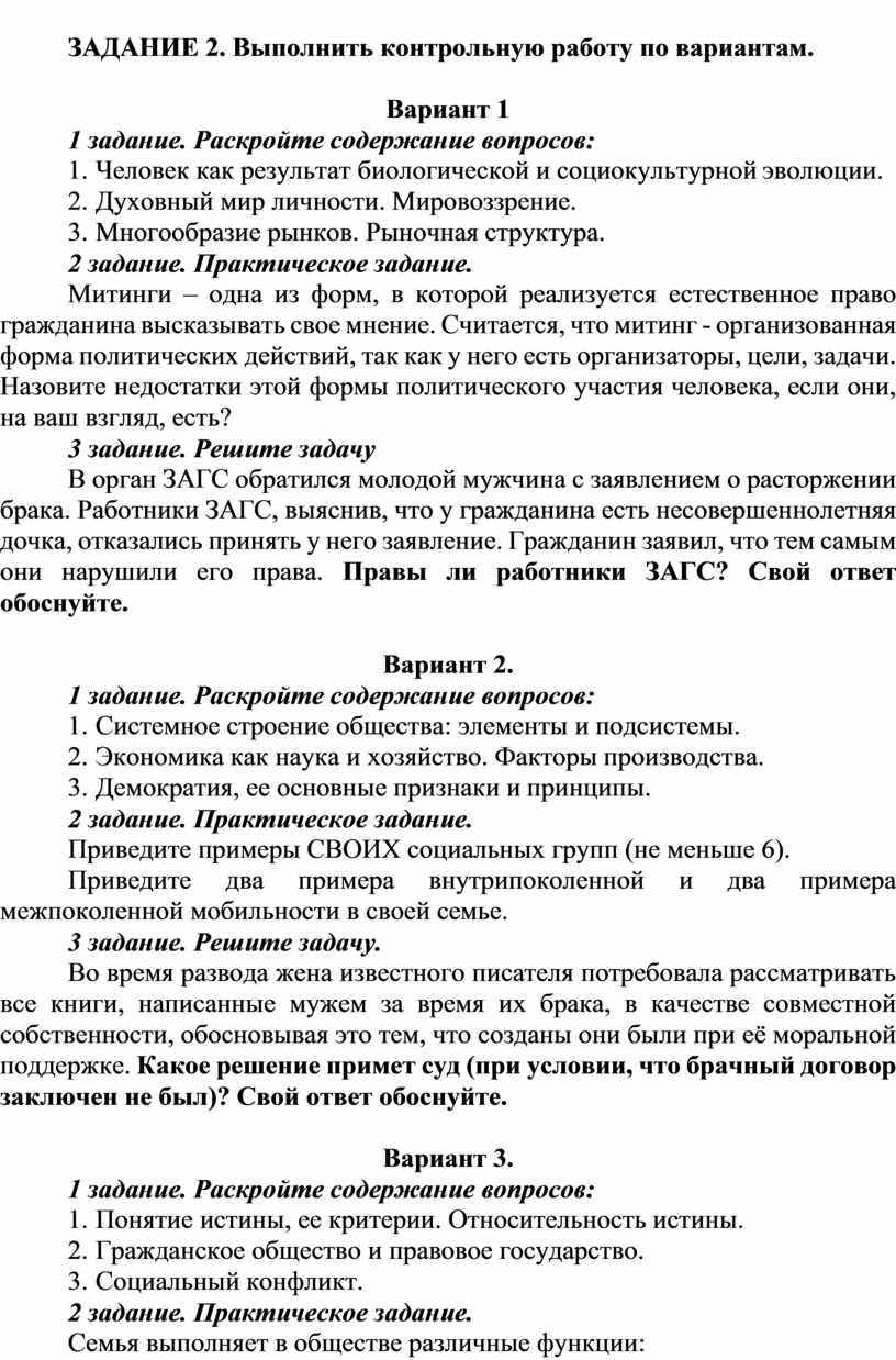 ЗАДАНИЕ 2. Выполнить контрольную работу по вариантам.
