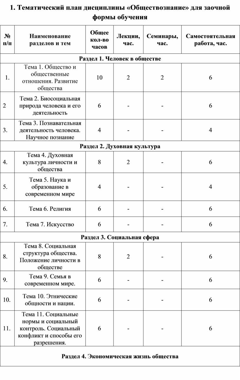 1. Тематический план дисциплины «Обществознание» для заочной формы обучения