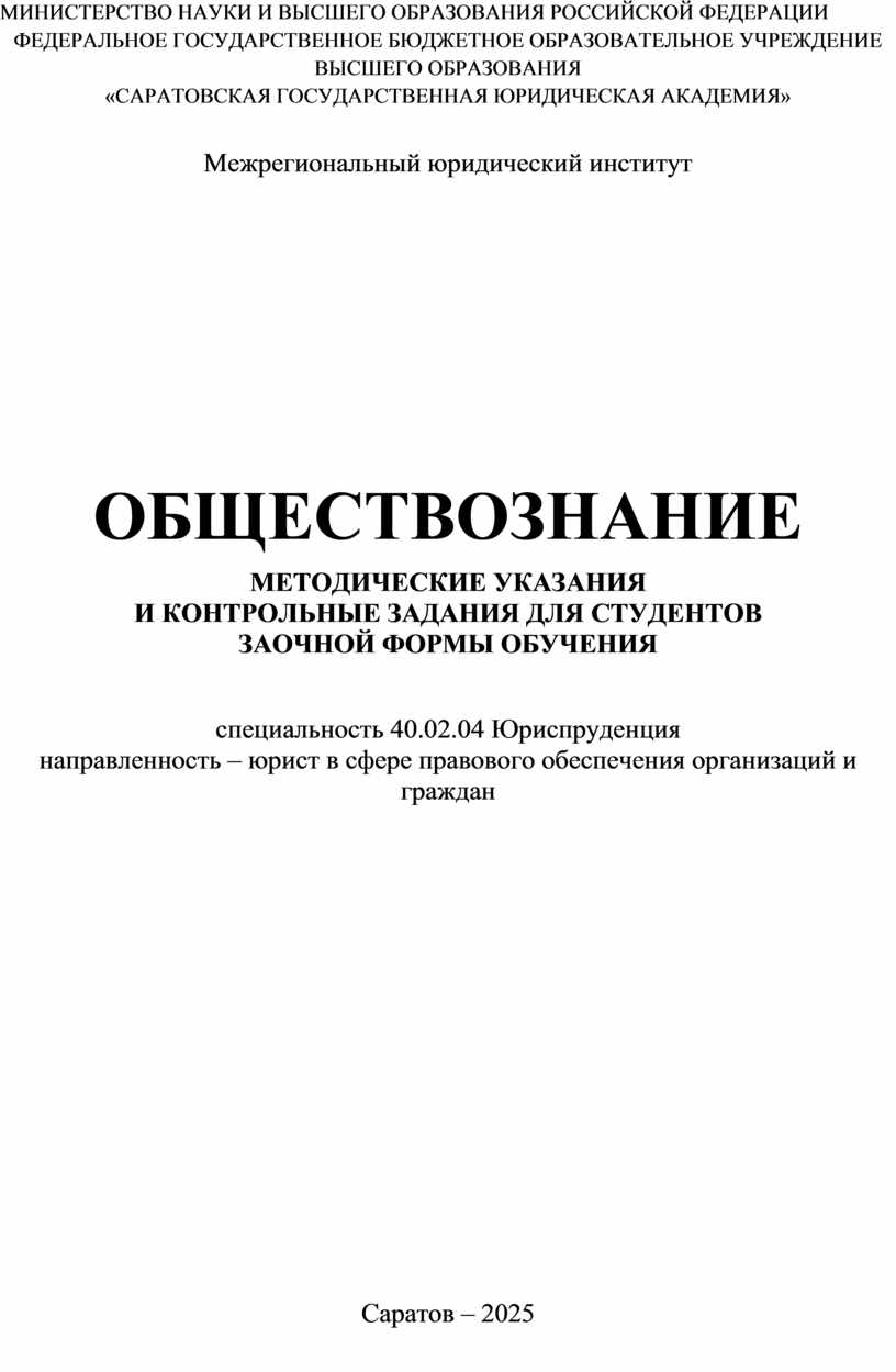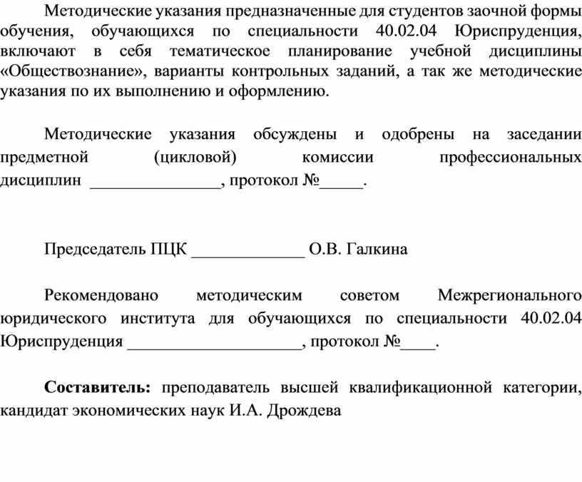 Методические указания предназначенные для студентов заочной формы обучения, обучающихся по специальности 40.02.04 Юриспруденция, включают в себя тематическое планирование учебной дисциплины «Обществознание», варианты контрольных заданий, а так же методические указания по их выполнению и оформлению.