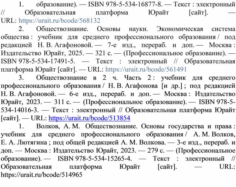 3. Обществознание в 2 ч. Часть 2 : учебник для среднего профессионального образования / Н. В. Агафонова [и др.] ; под редакцией Н. В. Агафоновой. — 6-е изд., перераб. и доп. — Москва : Издательство Юрайт, 2023. — 311 с. — (Профессиональное образование). — ISBN 978-5-534-14016-3. — Текст : электронный // Образовательная платформа Юрайт [сайт]. — URL: https://urait.ru/bcode/513854