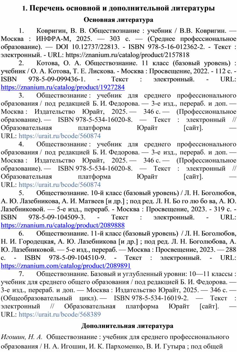 1. Игошин, Н. А. Обществознание : учебник для среднего профессионального образования / Н. А. Игошин, И. К. Пархоменко, В. И. Гутыра ; под общей редакцией Н. А. Игошина. — 2-е изд., перераб. и доп. — Москва : Издательство Юрайт, 2025. — 242 с. — (Профессиональное образование). — ISBN 978-5-534-16877-8. — Текст : электронный // Образовательная платформа Юрайт [сайт]. — URL: https://urait.ru/bcode/568132