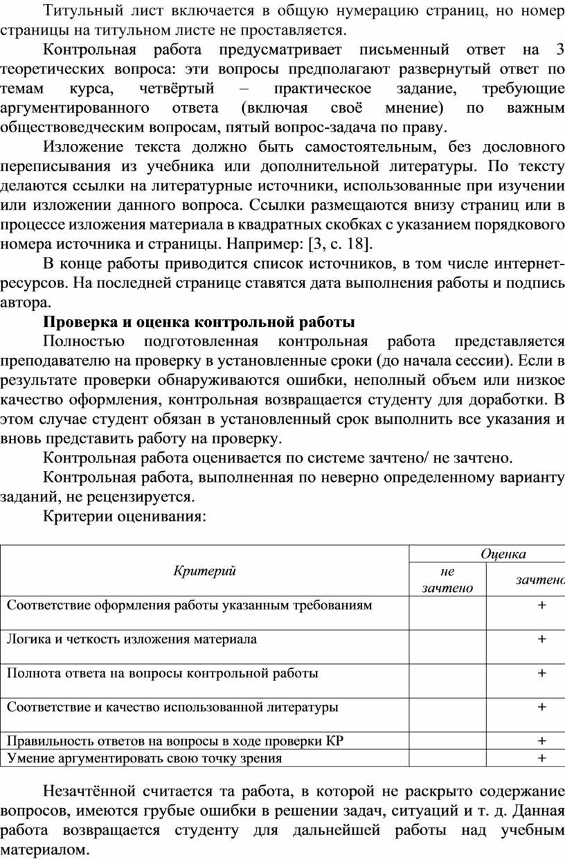 Незачтённой считается та работа, в которой не раскрыто содержание вопросов, имеются грубые ошибки в решении задач, ситуаций и т. д. Данная работа возвращается студенту для дальнейшей работы над учебным материалом.
