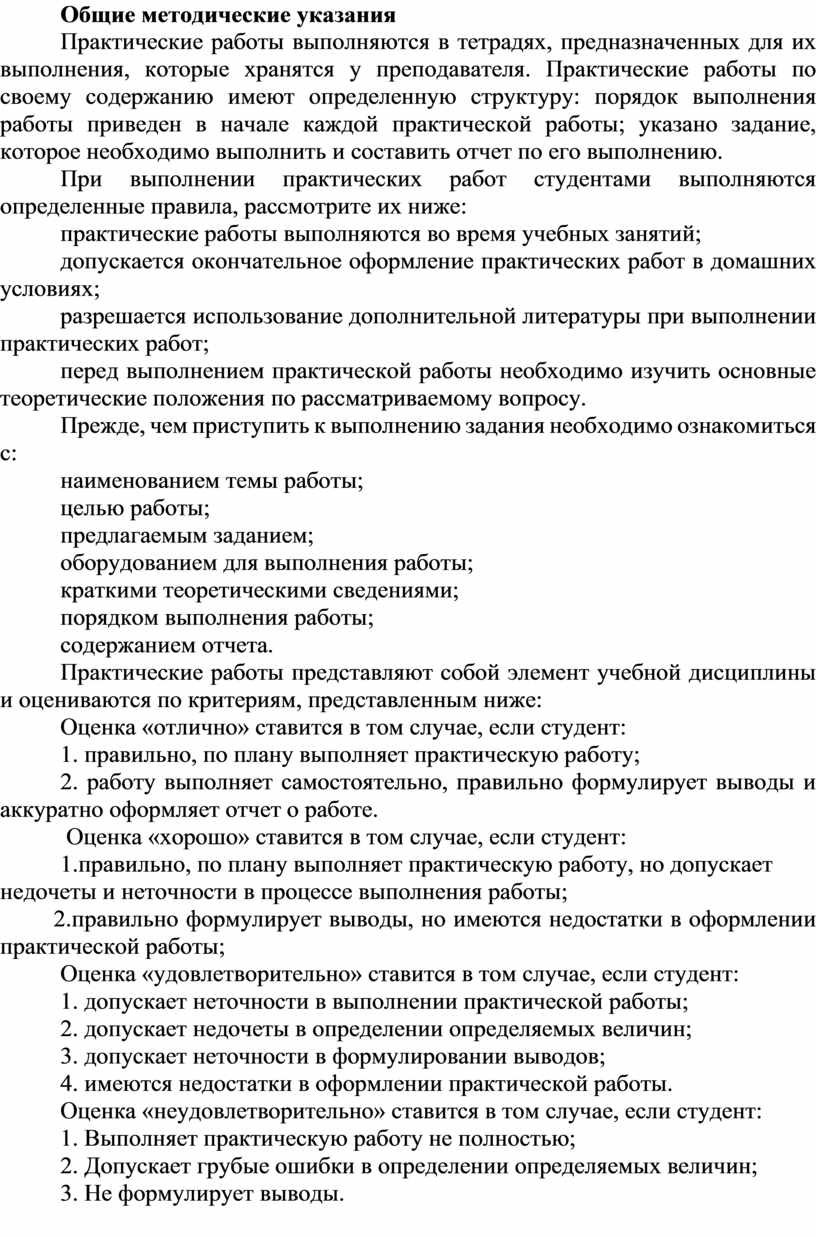 Практические работы выполняются в тетрадях, предназначенных для их выполнения, которые хранятся у преподавателя. Практические работы по своему содержанию имеют определенную структуру: порядок выполнения работы приведен в начале каждой практической работы; указано задание, которое необходимо выполнить и составить отчет по его выполнению.