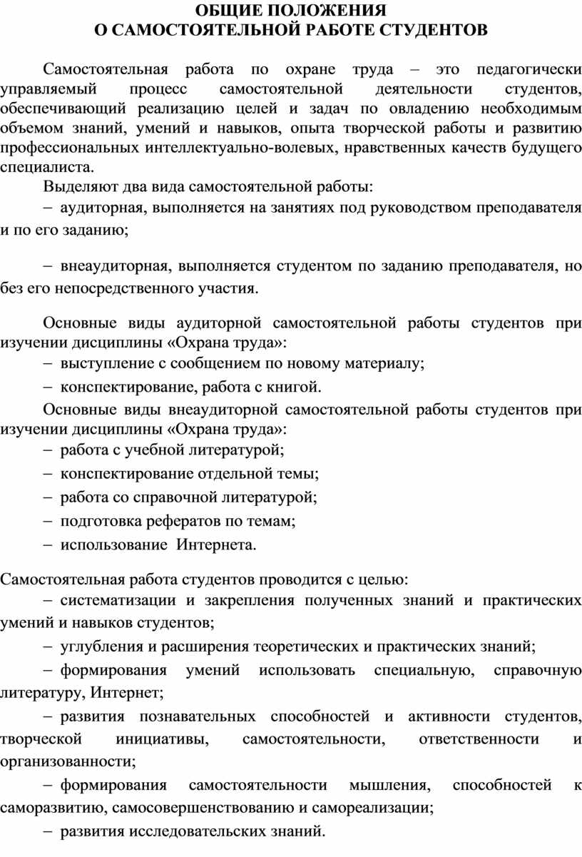 Самостоятельная работа по охране труда – это педагогически управляемый процесс самостоятельной деятельности студентов, обеспечивающий реализацию целей и задач по овладению необходимым объемом знаний, умений и навыков, опыта творческой работы и развитию профессиональных интеллектуально-волевых, нравственных качеств будущего специалиста.