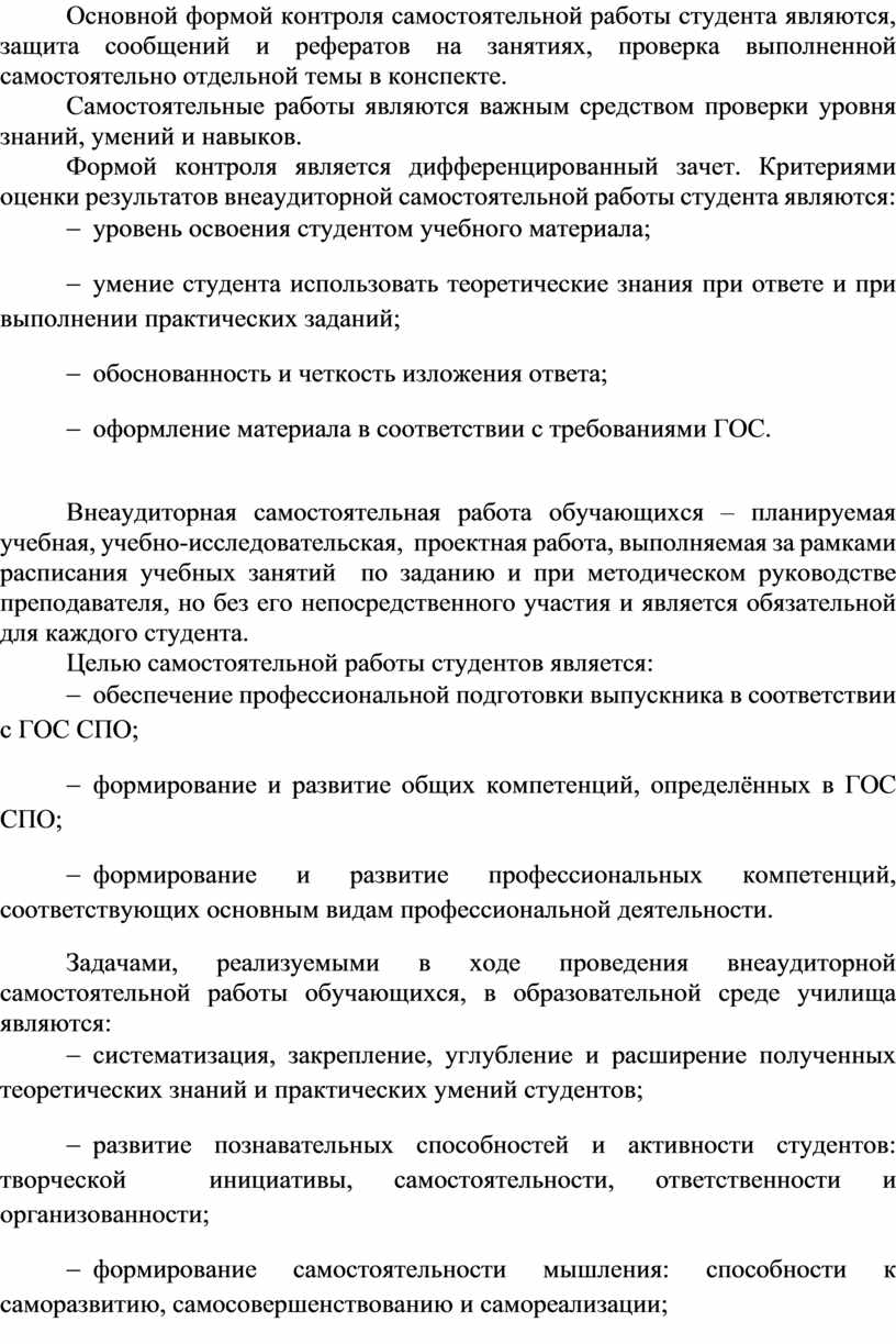 Задачами, реализуемыми в ходе проведения внеаудиторной самостоятельной работы обучающихся, в образовательной среде училища являются: