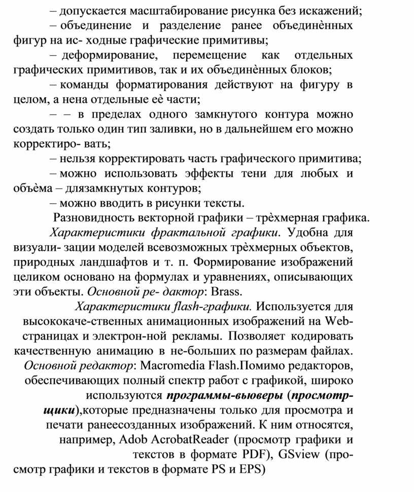 Характеристики flash-графики. Используется для высококаче- ственных анимационных изображений на Web-страницах и электрон- ной рекламы. Позволяет кодировать качественную анимацию в не- больших по размерам файлах. Основной редактор: Macromedia Flash. Помимо редакторов, обеспечивающих полный спектр работ с графикой, широко используются программы-вьюверы (просмотр- щики),которые предназначены только для просмотра и печати ранее созданных изображений. К ним относятся, например, Adob Acrobat Reader (просмотр графики и текстов в формате PDF), GSview (про-