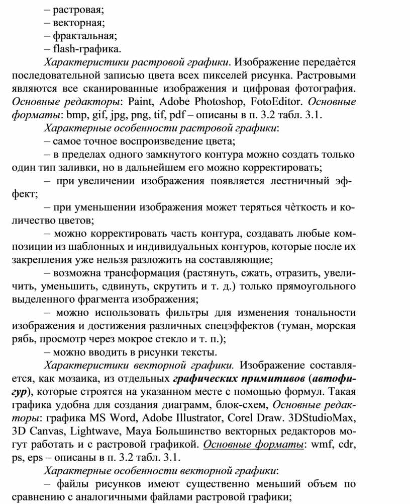 Характеристики растровой графики. Изображение передаѐтся последовательной записью цвета всех пикселей рисунка. Растровыми являются все сканированные изображения и цифровая фотография. Основные редакторы: Paint, Adobe Photoshop, FotoEditor. Основные форматы: bmp, gif, jpg, png, tif, pdf – описаны в п. 3.2 табл. 3.1.