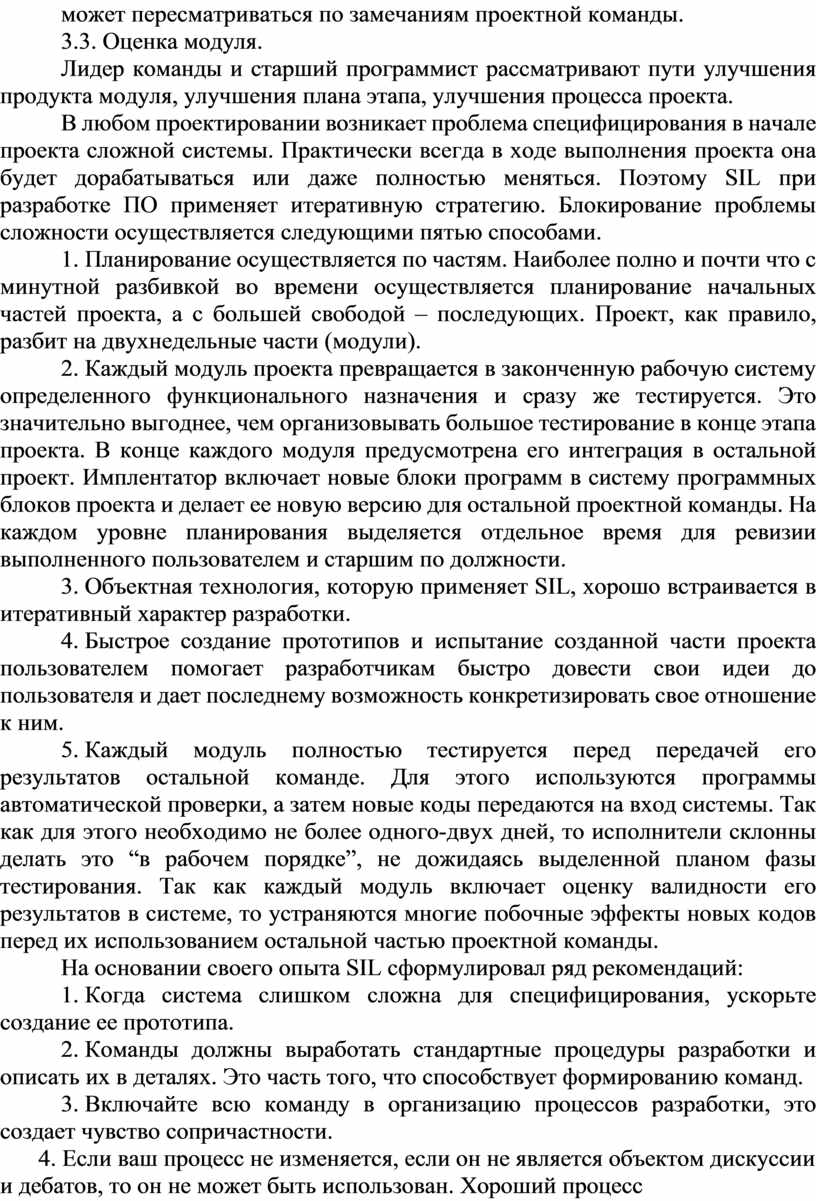 5. Каждый модуль полностью тестируется перед передачей его результатов остальной команде. Для этого используются программы автоматической проверки, а затем новые коды передаются на вход системы. Так как для этого необходимо не более одного-двух дней, то исполнители склонны делать это “в рабочем порядке”, не дожидаясь выделенной планом фазы тестирования. Так как каждый модуль включает оценку валидности его результатов в системе, то устраняются многие побочные эффекты новых кодов перед их использованием остальной частью проектной команды.