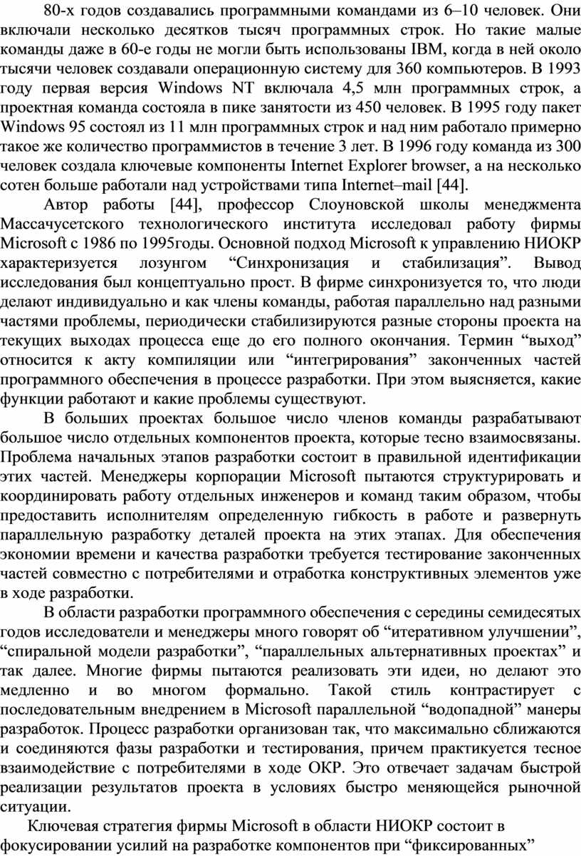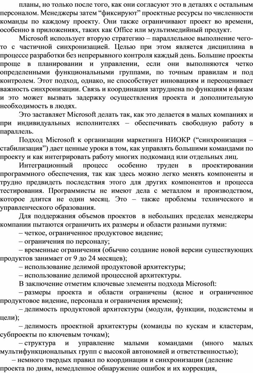 В области разработки программного обеспечения с середины семидесятых годов исследователи и менеджеры много говорят об “итеративном улучшении”, “спиральной модели разработки”, “параллельных альтернативных проектах” и так далее. Многие фирмы пытаются реализовать эти идеи, но делают это медленно и во многом формально. Такой стиль контрастирует с последовательным внедрением в Microsoft параллельной “водопадной” манеры разработок. Процесс разработки организован так, что максимально сближаются и соединяются фазы разработки и тестирования, причем практикуется тесное взаимодействие с потребителями в ходе ОКР. Это отвечает задачам быстрой реализации результатов проекта в условиях быстро меняющейся рыночной ситуации.