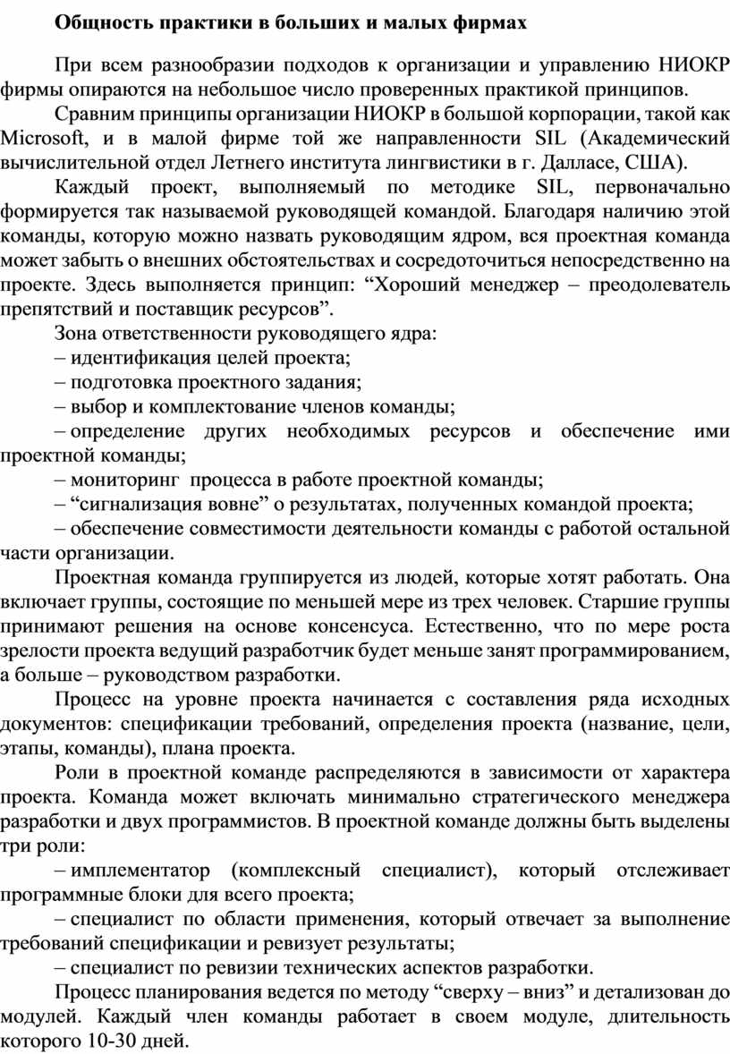 Сравним принципы организации НИОКР в большой корпорации, такой как Microsoft, и в малой фирме той же направленности SIL (Академический вычислительной отдел Летнего института лингвистики в г. Далласе, США).
