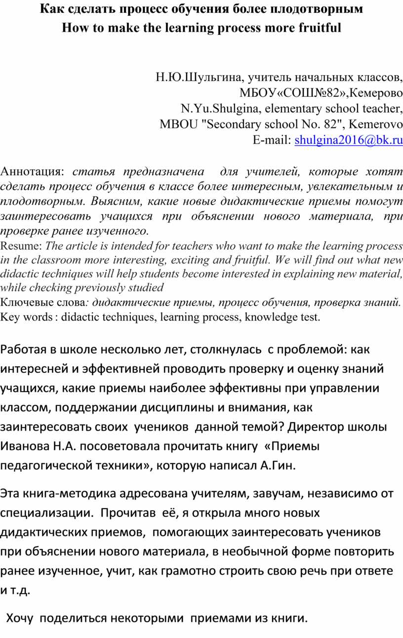 Ключевые слова: дидактические приемы, процесс обучения, проверка знаний.