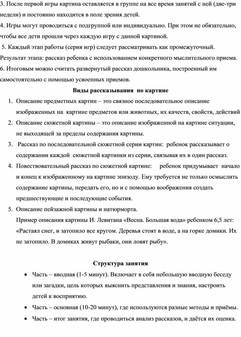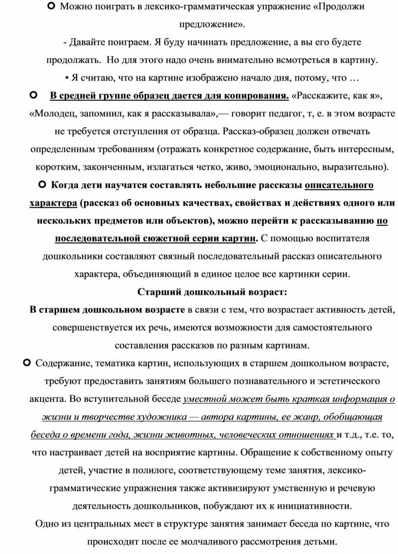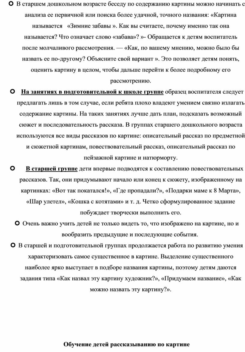 ¢ На занятиях в подготовительной к школе группе образец воспитателя следует предлагать лишь в том случае, если ребята плохо владеют умением связно излагать содержание картины. На таких занятиях лучше дать план, подсказать возможный сюжет и последовательность рассказа. В группах старшего дошкольного возраста используются все виды рассказов по картине: описательный рассказ по предметной и сюжетной картинам, повествовательный рассказ, описательный рассказ по пейзажной картине и натюрморту.