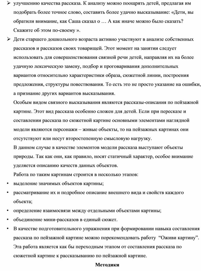 • В качестве подготовительного упражнения при формировании навыка составления рассказа по пейзажной картине можно порекомендовать работу “Оживи картину”. Эта работа является как бы переходным этапом от составления рассказа по сюжетной картине к рассказыванию по пейзажной картине.