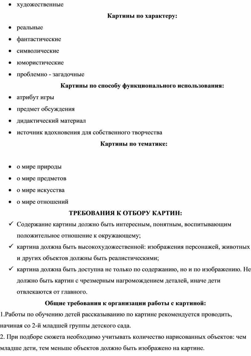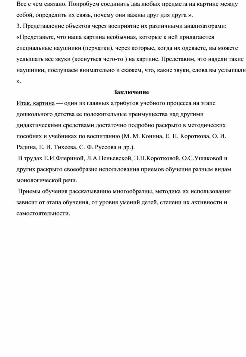 Картина — один из главных атрибутов учебного процесса на этапе дошкольного детства. ее положительные преимущества над другими дидактическими средствами достаточно подробно раскрыто в методических пособиях и учебниках по воспитанию (М. М. Конина, Е. П. Короткова, О. И. Радина, Е. И. Тихеева, С. Ф. Руссова и др.).