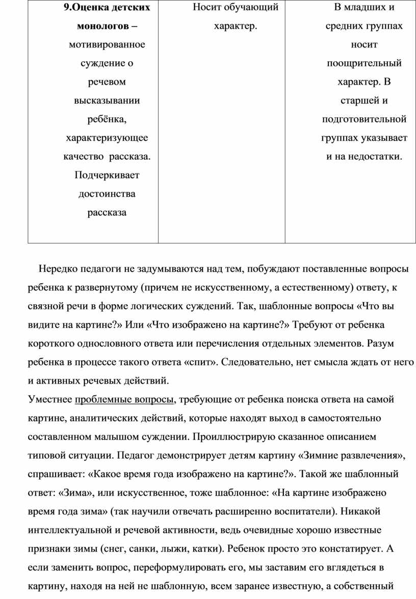 9.Оценка детских монологов –мотивированное суждение о речевом высказывании ребёнка, характеризующее качество рассказа. Подчеркивает достоинства рассказа |