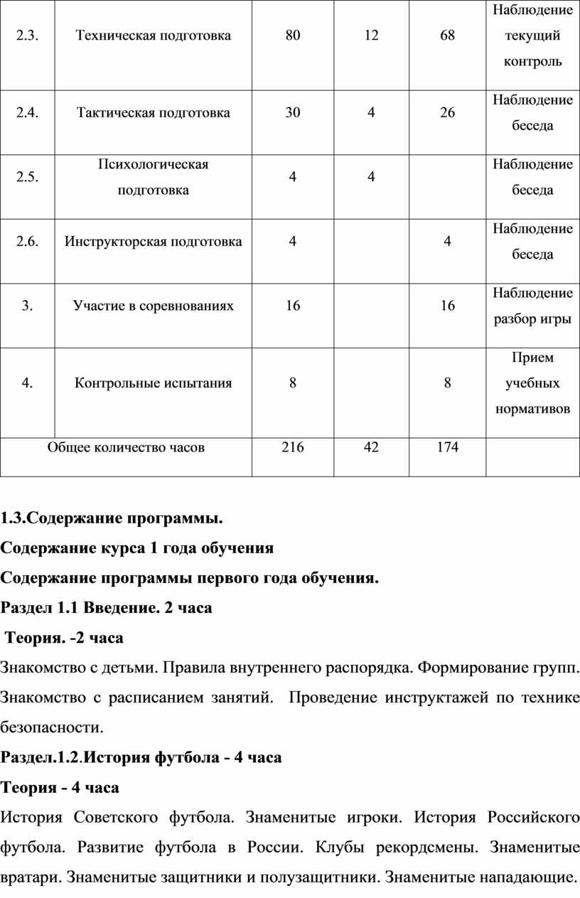 Первый год обучения – это когда с помощью соответствующих упражнений происходит овладение множеством простых и сложных технических элементов, приемов футбола и освоение широкого арсенала двигательных навыков. Первый год обучения по данной программе характеризуется применением большого количества одноцелевых упражнений, которые выполняются в простых условиях, что может сформировать прочные навыки в стабильных условиях. Приобретение дополнительных физических качеств влечет за собой постоянное совершенствование выполнения того или иного технического приема. В дальнейшем изучение элементов или приемов просходит с минимальным временем на обработку мяча, добавлением обманных движений, уменьшением площадки исполнения. На этом этапе закладывается основа техники футбола, являющейся фундаментом дальнейшей специализации.