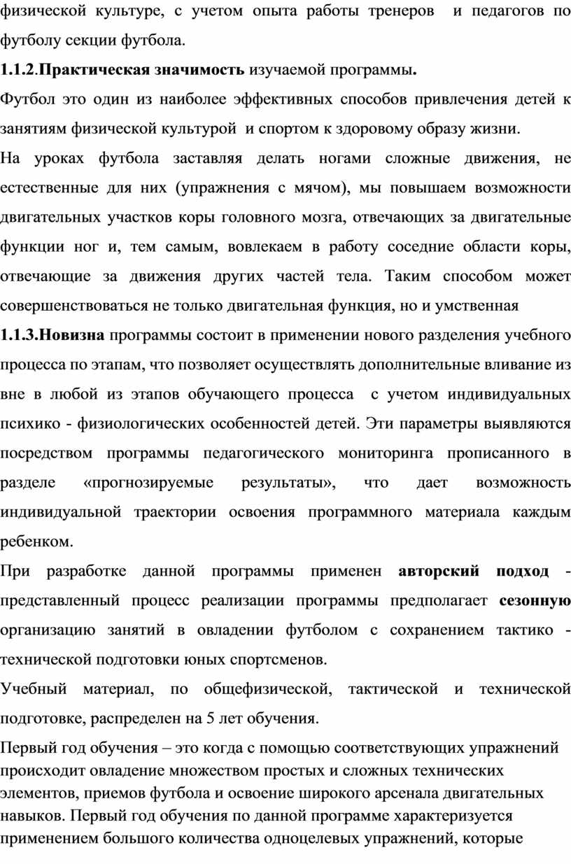 При разработке данной программы применен авторский подход - представленный процесс реализации программы предполагает сезонную организацию занятий в овладении футболом с сохранением тактико - технической подготовки юных спортсменов.