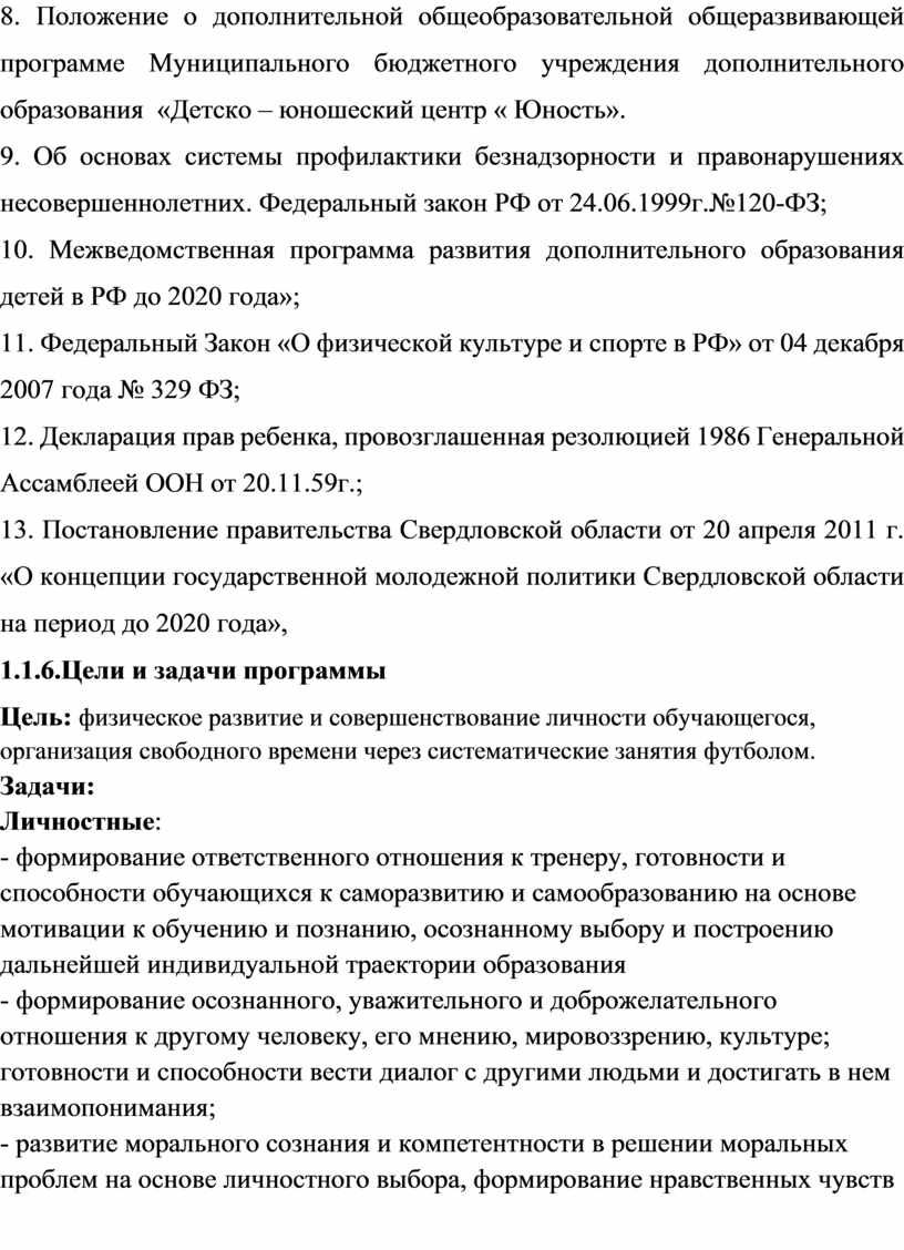 Дополнительная образовательная программа « Обучение футболу в условиях детско - юношеских клубов» составлена для Муниципального бюджетного образовательного учреждения дополнительного образования детей ДЮЦ «Юность». Программа разработана на основании существующих нормативных документов для учреждений дополнительного образования, нормативных документов для учреждений дополнительного образования по физической культуре, с учетом опыта работы тренеров и педагогов по футболу секции футбола.