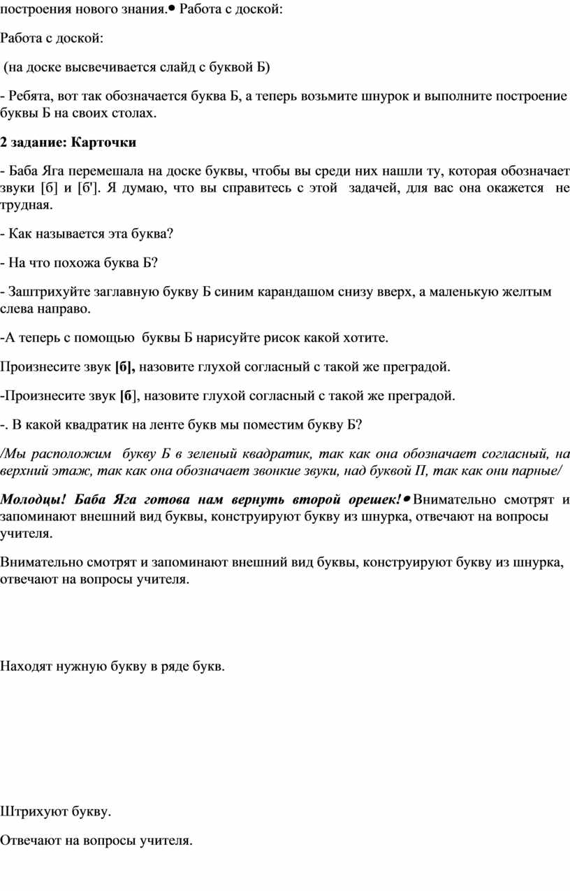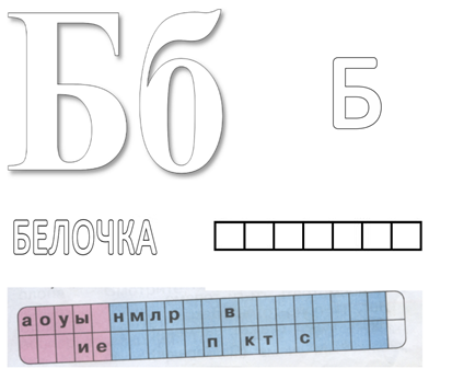 Работа с доской: (на доске высвечивается слайд с буквой Б) - Ребята, вот так обозначается буква Б, а теперь возьмите шнурок и выполните построение буквы Б на своих столах. 2 задание: Карточки - Баба Яга перемешала на доске буквы, чтобы вы среди них нашли ту, которая обозначает звуки [б] и [б']. Я думаю, что вы справитесь с этой задачей, для вас она окажется не трудная. - Как называется эта буква? - На что похожа буква Б? - Заштрихуйте заглавную букву Б синим карандашом снизу вверх, а маленькую желтым слева направо. -А теперь с помощью буквы Б нарисуйте рисок какой хотите. Произнесите звук [б], назовите глухой согласный с такой же преградой. -Произнесите звук [б], назовите глухой согласный с такой же преградой. -. В какой квадратик на ленте букв мы поместим букву Б? /Мы расположим букву Б в зеленый квадратик, так как она обозначает согласный, на верхний этаж, так как она обозначает звонкие звуки, над буквой П, так как они парные/ Молодцы! Баба Яга готова нам вернуть второй орешек! |