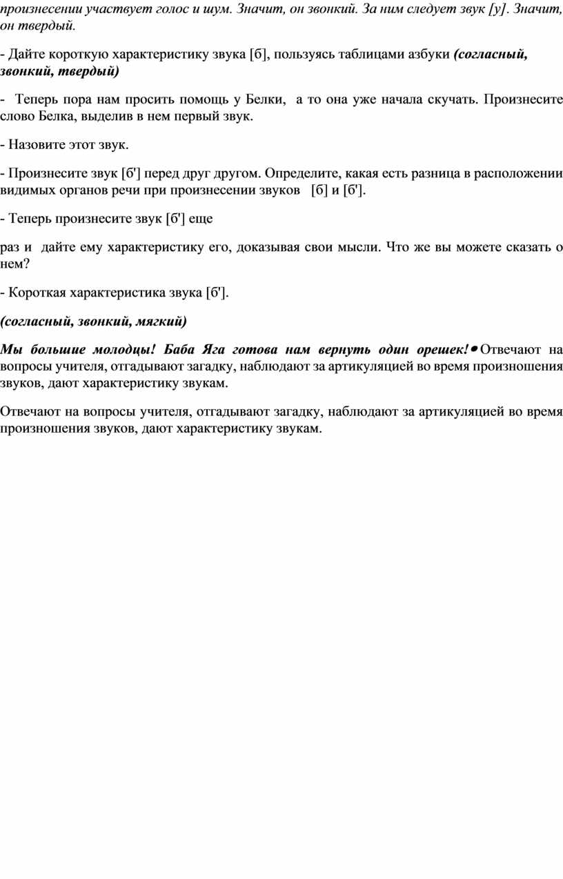 -Перейдем к первому задание. Для того, чтобы узнать, какое задание вы будете выполнять вам нужно снова разгадать загадку. Загадка: Скорлупки, ядра сложит в ряд, Сразу бусы заблестят. Ответ (Бусы) 1 задание: Определите и укажите первые звуки в словах БУСЫ и БЕЛКА - Приготовили ловушку: произносите слово БУСЫ, обозначив в нем первый звук. - Назовите выделенный звук. - Посмотрите на соседа по парте, еще раз повторите этот звук [б], определите, что мешает или воздух идет свободно; каков характер его звучания; какой звук следует за ним. Что вы можете сказать о нем? / При произношении звука [б] воздух встречает преграду. А это указывает на то, что, он согласный. В его произнесении участвует голос и шум. Значит, он звонкий. За ним следует звук [у]. Значит, он твердый. - Дайте короткую характеристику звука [б], пользуясь таблицами азбуки (согласный, звонкий, твердый) - Теперь пора нам просить помощь у Белки, а то она уже начала скучать. Произнесите слово Белка, выделив в нем первый звук. - Назовите этот звук. - Произнесите звук [б'] перед друг другом. Определите, какая есть разница в расположении видимых органов речи при произнесении звуков [б] и [б']. - Теперь произнесите звук [б'] еще раз и дайте ему характеристику его, доказывая свои мысли. Что же вы можете сказать о нем? - Короткая характеристика звука [б']. (согласный, звонкий, мягкий) Мы большие молодцы! Баба Яга готова нам вернуть один орешек! |