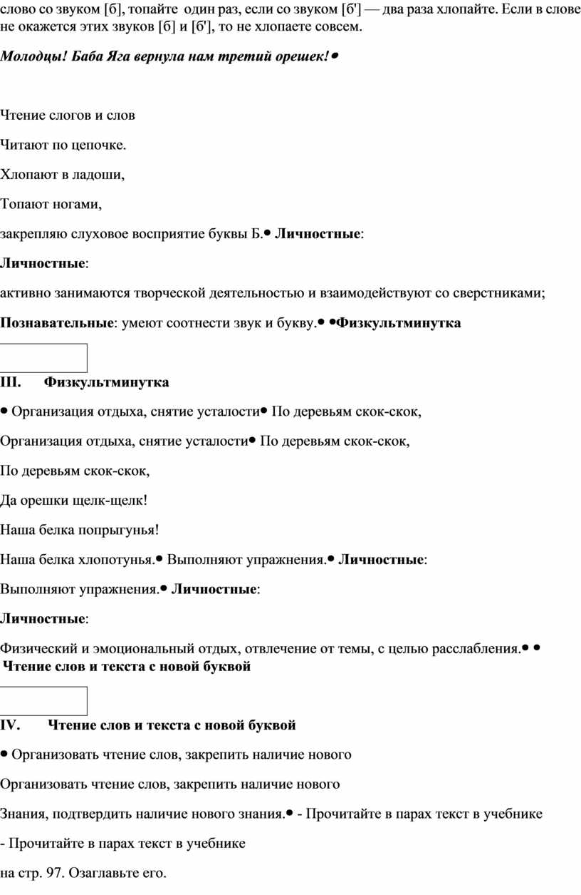 Предметные: научатся вычленять из потока речи звуки[б], [б'], узнавать буквы Б, б в тексте, читать слоги, слова с буквами Б, б