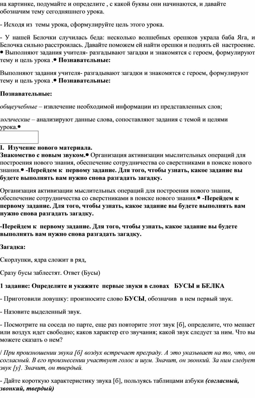 Обучающие: создание условий обучающимся для усвоения умения различать звуки [б], [б’] в словах и записывать эти звуки изученной буквой «Б»; создавать условия для открытия новых знаний, давать характеристику изученным звукам по алгоритму ; развивать выразительность и сознательность чтения; развивать фонематический слух и артикуляционный аппарат.