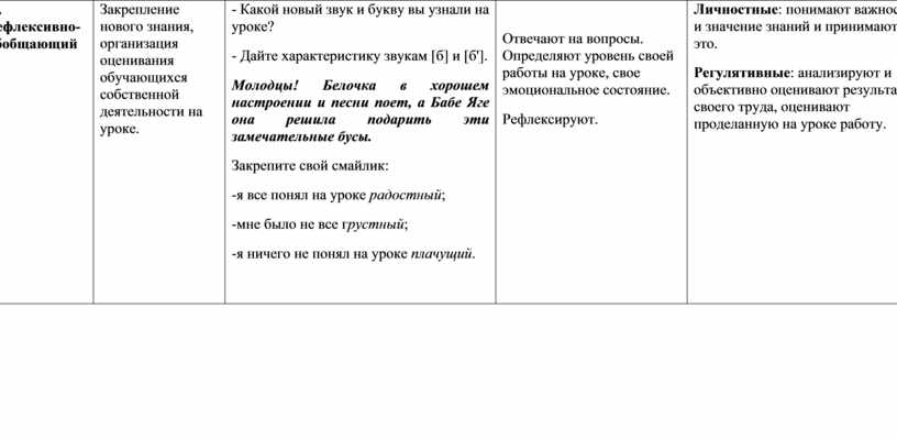 - Какой новый звук и букву вы узнали на уроке? - Дайте характеристику звукам [б] и [б']. Молодцы! Белочка в хорошем настроении и песни поет, а Бабе Яге она решила подарить эти замечательные бусы. Закрепите свой смайлик: -я все понял на уроке радостный; -мне было не все грустный; -я ничего не понял на уроке плачущий.