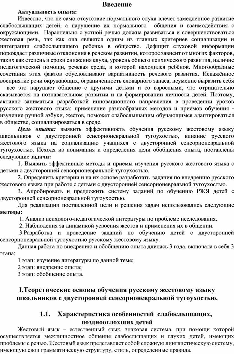 I.Теоретические основы обучения русскому жестовому языку школьников с двусторонней сенсорноневральной тугоухостью.