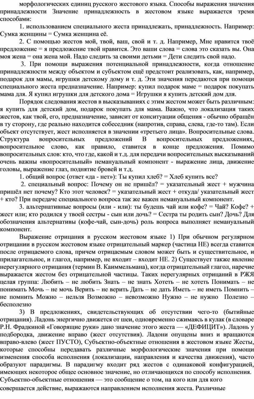Так, высказывания соответственно выражают значения: 'люди', 'деревья', или 'болтать' в течение длительного времени', указывают на тесную связь с конситуацией. Дифференциация конкретного значения в последнем случае осуществляется с помощью контекста, конситуации. обусловливающей и специфику структуры многих морфологических единиц русского жестового языка. Способы выражения значения принадлежности Значение принадлежность в жестовом языке выражается тремя способами: