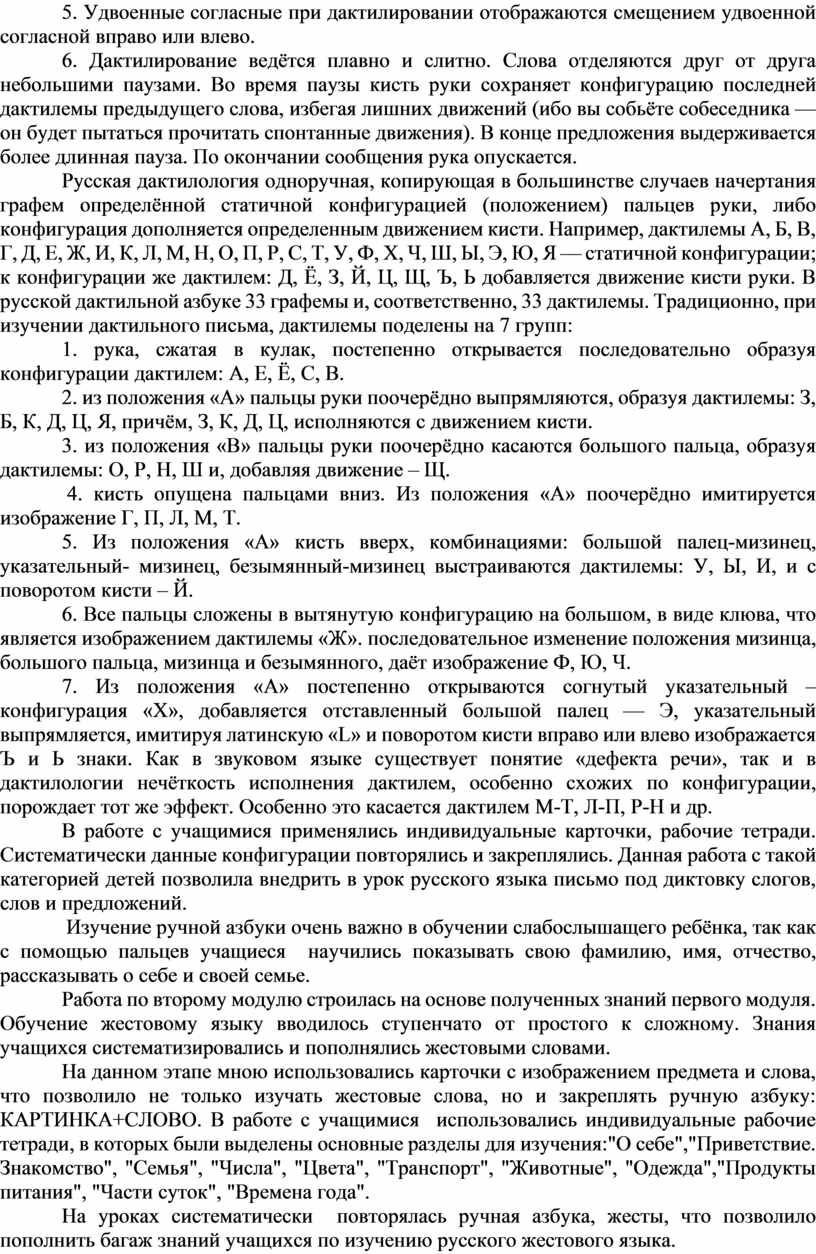 Осуществление деятельности проходило ступенчато от простого к сложному. На первом этапе обучения учащиеся изучали ручную азбуку - это правильное расположение руки, пальцев. На занятиях использовались основные правила дактилирования: