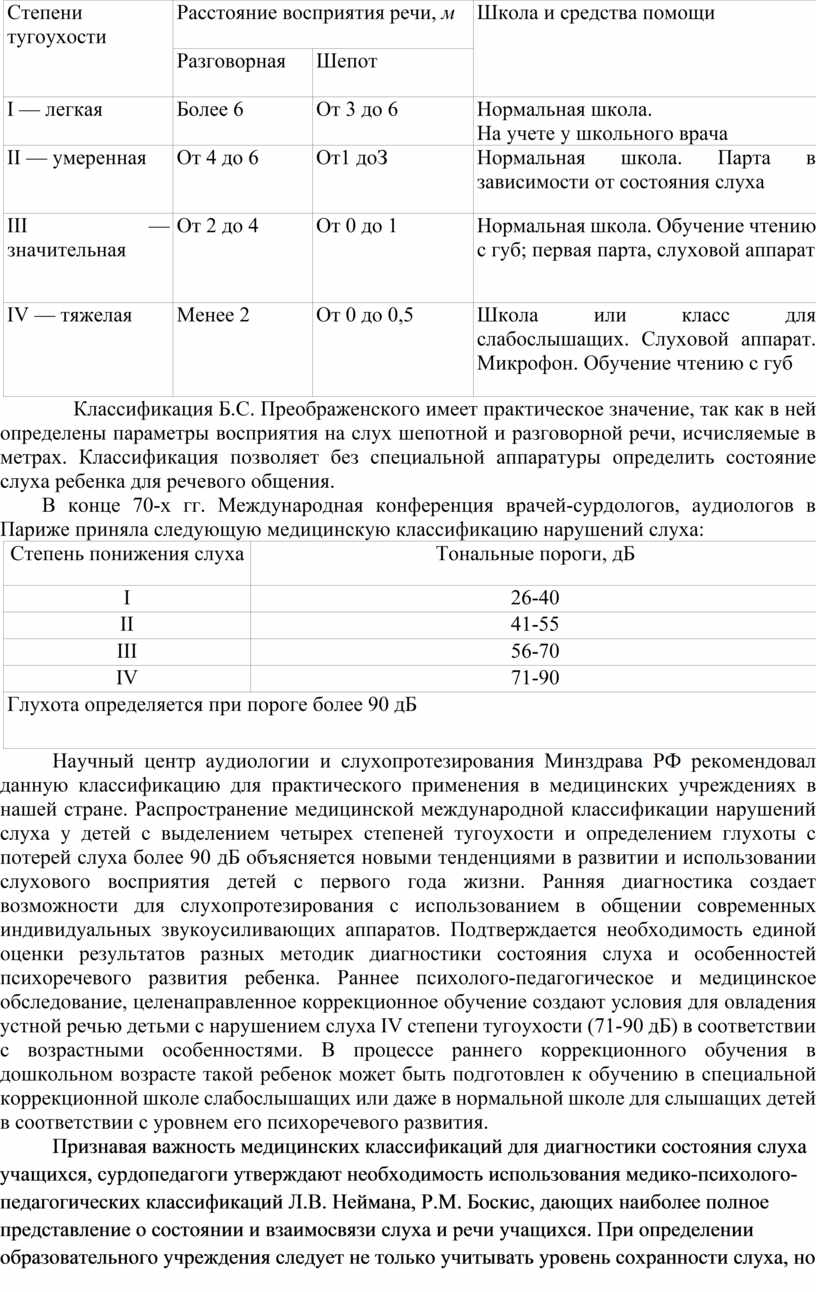 В медицинской практике сурдологи при диагностике состояния слуха учащихся ранее опирались чаще всего на классификации врачей (Б.С. Преображенский (1933), Г.В. Ковтун (1967). Г.В. Ковтун выделяет три степени тугоухости и глухоты. Б.С. Преображенский в зависимости от восприятия речи на слух (разговорной и шепотной) определяет уровень ее восприятия, исчисляемый в метрах. Выделяются четыре степени тугоухости: легкое снижение слуха, умеренное, значительное и тяжелое.