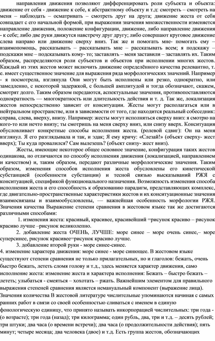 Базовый порядок слов в РЖЯ Исследований в области базового порядка слов в русском жестовом языке крайне мало. Исследованием данного вопроса занимались Г.Л. Зайцева, В. Киммельман. Галина Лазаревна пришла к выводу, что анализ синтаксиса РЖЯ в терминах субъект – объект– предикат малоэффективен. По исследованиям В. Киммельмана в русском жестовом языке в настоящий момент не выявлено строгого порядка слов. Однако есть некоторые ситуации, встречающиеся чаще других, например, наблюдения В. Киммельмана показали, что в настоящее время можно говорить о двух базовых порядках слов в РЖЯ: с простыми и согласующимися глаголами это подлежащие-сказуемое-дополнение, а с классификаторными конструкциями – подлежащее- дополнение-сказуемое. Одушевлённые дополнения предпочитают порядок сказуемое-дополнение, а неодушевлённые – дополнение-сказуемое. Прилагательные в РЖЯ чаще следуют за существительным, к которому они относятся, однако, в целом, позиция прилагательного может определяться лексически, так, прилагательное ДРУГОЙ почти всегда встречается перед существительным. Наречия в РЖЯ чаще всего предшествуют глаголу.. Наречия времени и места находятся обычно в начале предложения, а наречия образа действия – непосредственно перед глаголом. Позиция наречия тоже может определяться лексически, так, наречие ДОМОЙ почти всегда следует за глаголом. Глаголы НЕЛЬЗЯ и ЗАПРЕЩЕНО встречаются только после зависимого, а глагол ХОТЕТЬ чаще встречается до зависимого. Довольно часто потенциальные модальные слова повторяются. Способы выражения множественности Значение передаётся в РЖЯ следующими основными способами: 1. Аналитический, когда к жесту-номинативу добавляются специальный жест: много, разный, или разнообразный. Например: посуда = тарелки много. Будет нужна посуда = будет надо тарелки много. Надо приготовить посуду = надо тарелки разнообразные. Росли деревья= дерево растёт много; 2. Повторение жеста номинатива либо одной рукой, либо добавлением второй руки: Надо купить тарелки, тарелки. Пришли много человек = приходить человек, человек, человек (поочерёдно двумя руками жест человек). Росли деревья= дерево, дерево, дерево. Если жест двуручный, то жест повторяется несколько раз двумя руками. Так же, повторение одно или двуручного жеста номинатива может означать и длительность времени, например: болтать, болтать, болтать; стоять, стоять, стоять, смотреть, смотреть, смотреть. 3. Замена жеста номинатива на обобщающий. Например: На концерт придут много людей = концерт толпа. Придут люди = человек собраться; Росли деревья = лес (парк). С утра до вечера болтать, язык на плечо стоять. Дифференциация конкретного значения осуществляется с помощью контекста. Тесная связь с конситуацией обусловливает и специфику структуры многих морфологических единиц русского жестового языка.