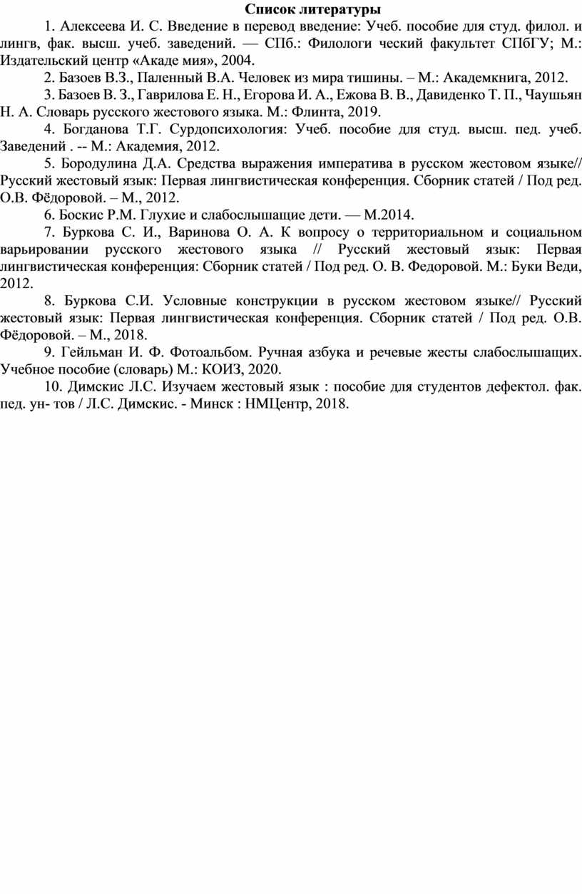 10. Димскис Л.С. Изучаем жестовый язык : пособие для студентов дефектол. фак. пед. ун- тов / Л.С. Димскис. - Минск : НМЦентр, 2018.