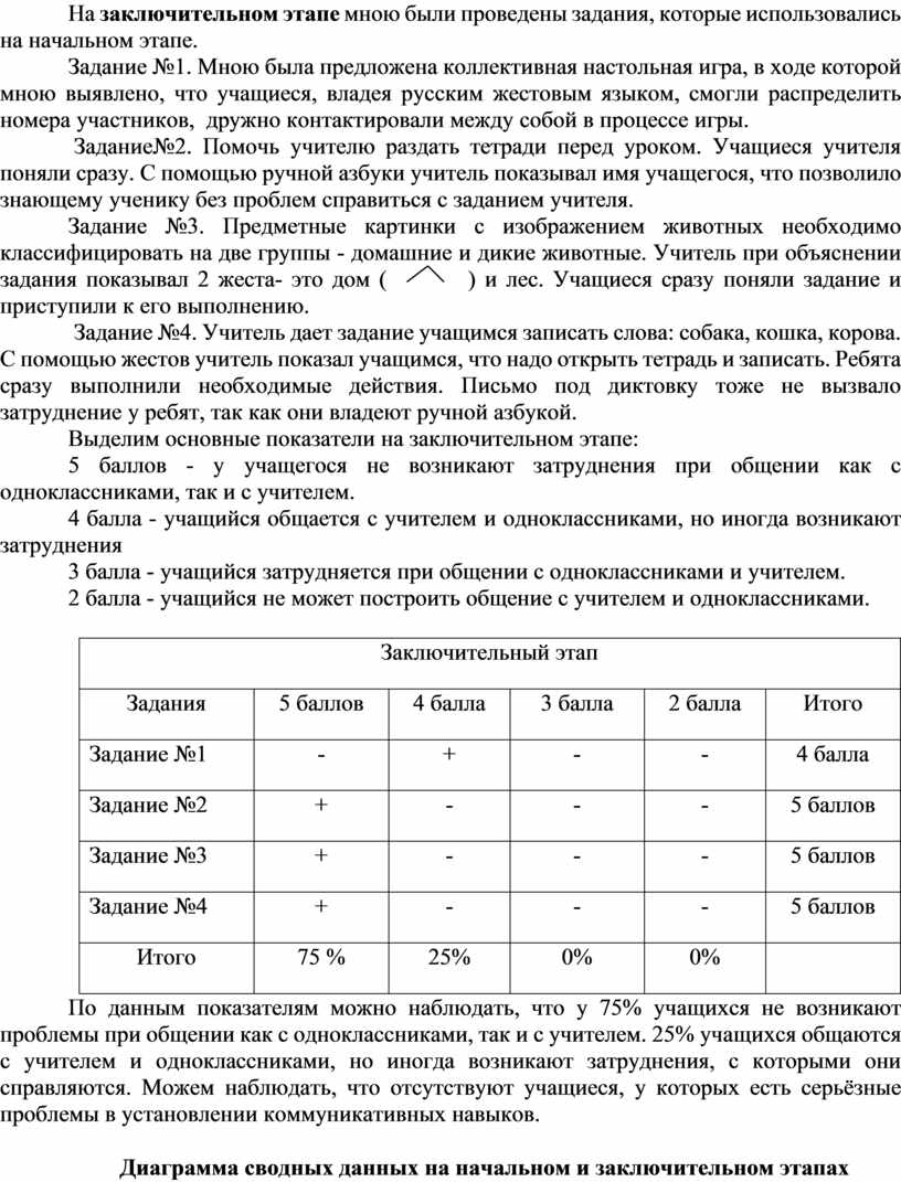 По данным показателям можно наблюдать, что на начальном этапе учащиеся не могли построить общение с одноклассниками и учителем, так как не владели русским жестовым языком. На заключительном этапе, мы можем наблюдать положительный результат, повышение коммуникативных навыков. Следовательно, можно сделать вывод, что изучение и внедрение русского жестового языка в работу с детьми с двусторонней сенсоневральной тугоухостью IV степени актуально, помогает учащимся социализироваться в школьной среде и в обществе, развивает коммуникативные навыки.