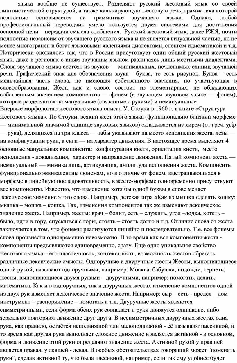 Во-первых, исследование национальных жестовых языков (В. Стоку, М. Бренон, Г.Л. Зайцева) показало, что жестовые языки — полноценные, сложные и самостоятельные лингвистические системы со своей особой грамматикой, лексикой, морфологией.