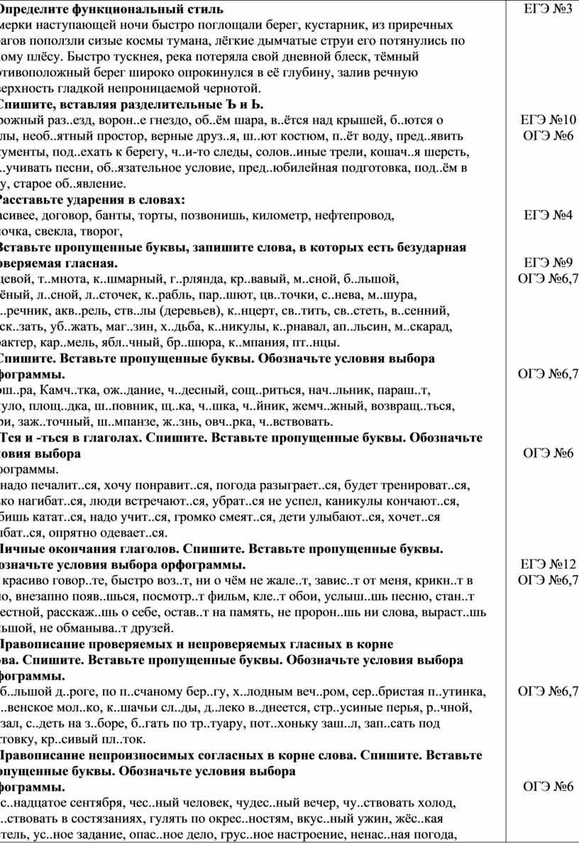 1. Определите функциональный стиль Сумерки наступающей ночи быстро поглощали берег, кустарник, из приречных оврагов поползли сизые космы тумана, лёгкие дымчатые струи его потянулись по тихому плёсу. Быстро тускнея, река потеряла свой дневной блеск, тёмный противоположный берег широко опрокинулся в её глубину, залив речную поверхность гладкой непроницаемой чернотой. 2. Спишите, вставляя разделительные Ъ и Ь. Дорожный раз..езд, ворон..е гнездо, об..ём шара, в..ётся над крышей, б..ются о скалы, необ..ятный простор, верные друз..я, ш..ют костюм, п..ёт воду, пред..явить документы, под..ехать к берегу, ч..и-то следы, солов..иные трели, кошач..я шерсть, раз..учивать песни, об..язательное условие, пред..юбилейная подготовка, под..ём в гору, старое об..явление. 3. Расставьте ударения в словах: Красивее, договор, банты, торты, позвонишь, километр, нефтепровод, цепочка, свекла, творог, 4. Вставьте пропущенные буквы, запишите слова, в которых есть безударная проверяемая гласная. Л..цевой, т..мнота, к..шмарный, г..рлянда, кр..вавый, м..сной, б..льшой, з..лёный, л..сной, л..сточек, к..рабль, пар..шют, цв..точки, с..нева, м..шура, скв..речник, акв..рель, ств..лы (деревьев), к..нцерт, св..тить, св..стеть, в..сенний, расск..зать, уб..жать, маг..зин, х..дьба, к..никулы, к..рнавал, ап..льсин, м..скарад, х..рактер, кар..мель, ябл..чный, бр..шюра, к..мпания, пт..нцы. 5. Спишите. Вставьте пропущенные буквы. Обозначьте условия выбора орфограммы. Брош..ра, Камч..тка, ож..дание, ч..десный, сощ..риться, нач..льник, параш..т, ч..чуло, площ..дка, ш..повник, щ..ка, ч..шка, ч..йник, жемч..жный, возвращ..ться, ж..ри, заж..точный, ш..мпанзе, ж..знь, овч..рка, ч..вствовать. 6. -Тся и -ться в глаголах. Спишите. Вставьте пропущенные буквы. Обозначьте условия выбора орфограммы. Не надо печалит..ся, хочу понравит..ся, погода разыграет..ся, будет тренироват..ся, низко нагибат..ся, люди встречают..ся, убрат..ся не успел, каникулы кончают..ся, любишь катат..ся, надо учит..ся, громко смеят..ся, дети улыбают..ся, хочет..ся улыбат..ся, опрятно одевает..ся. 7. Личные окончания глаголов. Спишите. Вставьте пропущенные буквы. Обозначьте условия выбора орфограммы. Вы красиво говор..те, быстро воз..т, ни о чём не жале..т, завис..т от меня, крикн..т в окно, внезапно появ..шься, посмотр..т фильм, кле..т обои, услыш..шь песню, стан..т известной, расскаж..шь о себе, остав..т на память, не пророн..шь ни слова, выраст..шь большой, не обманыва..т друзей. 8. Правописание проверяемых и непроверяемых гласных в корне слова. Спишите. Вставьте пропущенные буквы. Обозначьте условия выбора орфограммы. На б..льшой д..роге, по п..счаному бер..гу, х..лодным веч..ром, сер..бристая п..утинка, дер..венское мол..ко, к..шачьи сл..ды, д..леко в..днеется, стр..усиные перья, р..чной, в..кзал, с..деть на з..боре, б..гать по тр..туару, пот..хоньку заш..л, зап..сать под д..ктовку, кр..сивый пл..ток. 9. Правописание непроизносимых согласных в корне слова. Спишите. Вставьте пропущенные буквы. Обозначьте условия выбора орфограммы. Шес..надцатое сентября, чес..ный человек, чудес..ный вечер, чу..ствовать холод, уча..ствовать в состязаниях, гулять по окрес..ностям, вкус..ный ужин, жёс..кая постель, ус..ное задание, опас..ное дело, грус..ное настроение, ненас..ная погода, здра..ствуйте, звёз..ное небо, крутая лес..ница