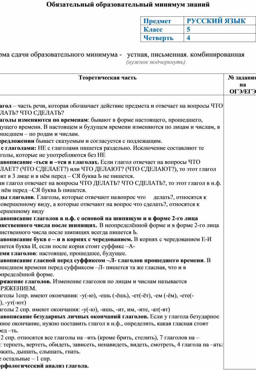 Глагол – часть речи, которая обозначает действие предмета и отвечает на вопросы ЧТО ДЕЛАТЬ? ЧТО СДЕЛАТЬ? Глаголы изменяются по временам: бывают в форме настоящего, прошедшего, будущего времени. В настоящем и будущем времени изменяются по лицам и числам, в прошедшем – по родам и числам. В предложении бывает сказуемым и согласуется с подлежащим. Не с глаголами: НЕ с глаголами пишется раздельно. Исключение составляют те глаголы, которые не употребляются без НЕ Правописание -ться и –тся в глаголах. Если глагол отвечает на вопросы ЧТО ДЕЛАЕТ? (ЧТО СДЕЛАЕТ?) или ЧТО ДЕЛАЮТ? (ЧТО СДЕЛАЮТ?), то этот глагол стоит в 3 лице и в нём перед – СЯ буква Ь не пишется. Если глагол отвечает на вопросы ЧТО ДЕЛАТЬ? ЧТО СДЕЛАТЬ?, то этот глагол в н.ф. и в нём перед –СЯ буква Ь пишется. Виды глаголов. Глаголы, которые отвечают на вопрос что делать?, относятся к несовершенному виду, а которые отвечают на вопрос что сделать?, относятся к совершенному виду Правописание глаголов в н.ф. с основой на шипящую и в форме 2-го лица единственного числа после шипящих. В неопределённой форме и в форме 2-го лица единственного числа после шипящих всегда пишется Ь. Правописание букв е – и в корнях с чередованием. В корнях с чередованием Е-И пишется буква И, если после корня стоит суффикс –А- Время глаголов: настоящее, прошедшее, будущее. Правописание гласной перед суффиксом –Л- глаголов прошедшего времени. В прошедшем времени перед суффиксом –Л- пишется та же гласная, что и в неопределённой форме. Спряжение глаголов. Изменение глаголов по лицам и числам называется СПРЯЖЕНИЕМ. Глаголы 1спр. имеют окончания: -у(-ю), -ешь (-ёшь), -ет(-ёт), -ем (-ём), -ете(- ёте), -ут(-ют) Глаголы 2 спр. имеют окончания: -у(-ю), -ишь, -ит, им, -ите, -ат(-ят) Правописание безударных личных окончаний глаголов. Если у глагола безударное личное окончание, нужно поставить глагол в н.ф., определить, какая гласная стоит перед –ть. Ко 2 спр. относятся все глаголы на –ить (кроме брить, стелить), 7 глаголов на – еть: терпеть, вертеть, обидеть, зависеть, ненавидеть, видеть, смотреть, 4 глагола на –ать: держать, дышать, слышать, гнать. Все остальные – 1 спр. Морфологический анализ глагола.  |
