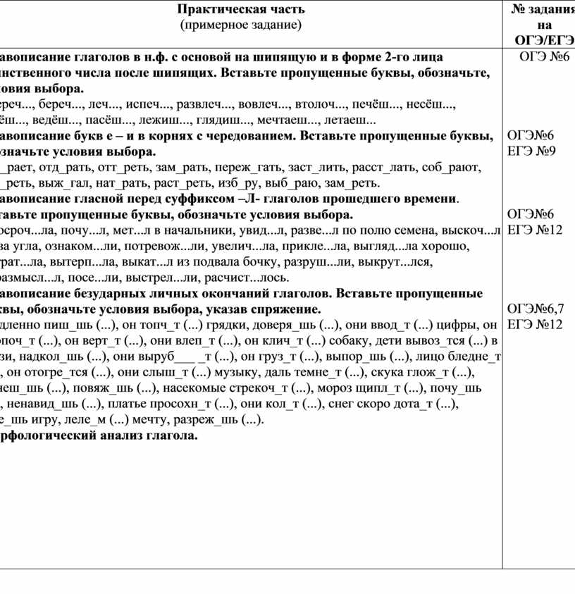 Правописание глаголов в н.ф. с основой на шипящую и в форме 2-го лица единственного числа после шипящих. Вставьте пропущенные буквы, обозначьте, условия выбора. Стереч..., береч..., леч..., испеч..., развлеч..., вовлеч..., втолоч..., печёш..., несёш..., везёш..., ведёш..., пасёш..., лежиш..., глядиш..., мечтаеш..., летаеш... Правописание букв е – и в корнях с чередованием. Вставьте пропущенные буквы, обозначьте условия выбора. Заб_рает, отд_рать, отт_реть, зам_рать, переж_гать, заст_лить, расст_лать, соб_рают, зап_реть, выж_гал, нат_рать, раст_реть, изб_ру, выб_раю, зам_реть. Правописание гласной перед суффиксом –Л- глаголов прошедшего времени. Вставьте пропущенные буквы, обозначьте условия выбора. Просроч...ла, почу...л, мет...л в начальники, увид...л, разве...л по полю семена, выскоч...л из-за угла, ознаком...ли, потревож...ли, увелич...ла, прикле...ла, выгляд...ла хорошо, потрат...ла, вытерп...ла, выкат...л из подвала бочку, разруш...ли, выкрут...лся, поразмысл...л, посе...ли, выстрел...ли, расчист...лось. Правописание безударных личных окончаний глаголов. Вставьте пропущенные буквы, обозначьте условия выбора, указав спряжение. Медленно пиш_шь (...), он топч_т (...) грядки, доверя_шь (...), они ввод_т (...) цифры, он хлопоч_т (...), он верт_т (...), они влеп_т (...), он клич_т (...) собаку, дети вывоз_тся (...) в грязи, надкол_шь (...), они выруб___ _т (...), он груз_т (...), выпор_шь (...), лицо бледне_т (...), он отогре_тся (...), они слыш_т (...) музыку, даль темне_т (...), скука глож_т (...), вычеш_шь (...), повяж_шь (...), насекомые стрекоч_т (...), мороз щипл_т (...), почу_шь (...), ненавид_шь (...), платье просохн_т (...), они кол_т (...), снег скоро дота_т (...), зате_шь игру, леле_м (...) мечту, разреж_шь (...). Морфологический анализ глагола.