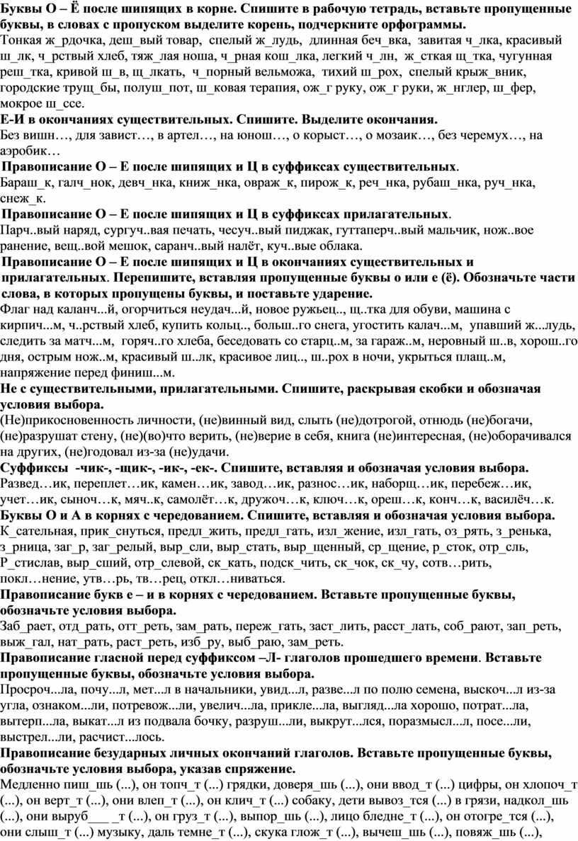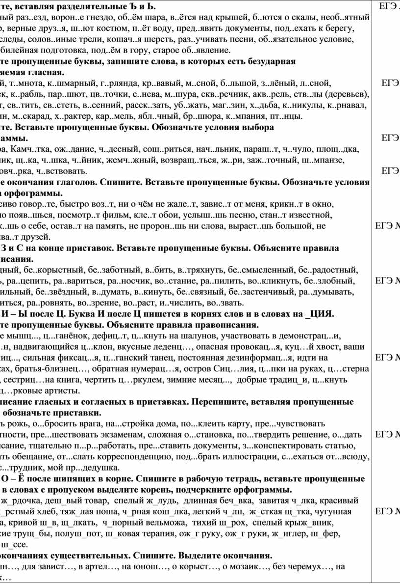Спишите, вставляя разделительные Ъ и Ь. Дорожный раз..езд, ворон..е гнездо, об..ём шара, в..ётся над крышей, б..ются о скалы, необ..ятный простор, верные друз..я, ш..ют костюм, п..ёт воду, пред..явить документы, под..ехать к берегу, ч..и-то следы, солов..иные трели, кошач..я шерсть, раз..учивать песни, об..язательное условие, пред..юбилейная подготовка, под..ём в гору, старое об..явление. Вставьте пропущенные буквы, запишите слова, в которых есть безударная проверяемая гласная. Л..цевой, т..мнота, к..шмарный, г..рлянда, кр..вавый, м..сной, б..льшой, з..лёный, л..сной, л..сточек, к..рабль, пар..шют, цв..точки, с..нева, м..шура, скв..речник, акв..рель, ств..лы (деревьев), к..нцерт, св..тить, св..стеть, в..сенний, расск..зать, уб..жать, маг..зин, х..дьба, к..никулы, к..рнавал, ап..льсин, м..скарад, х..рактер, кар..мель, ябл..чный, бр..шюра, к..мпания, пт..нцы. Спишите. Вставьте пропущенные буквы. Обозначьте условия выбора орфограммы. Брош..ра, Камч..тка, ож..дание, ч..десный, сощ..риться, нач..льник, параш..т, ч..чуло, площ..дка, ш..повник, щ..ка, ч..шка, ч..йник, жемч..жный, возвращ..ться, ж..ри, заж..точный, ш..мпанзе, ж..знь, овч..рка, ч..вствовать. Личные окончания глаголов. Спишите. Вставьте пропущенные буквы. Обозначьте условия выбора орфограммы. Вы красиво говор..те, быстро воз..т, ни о чём не жале..т, завис..т от меня, крикн..т в окно, внезапно появ..шься, посмотр..т фильм, кле..т обои, услыш..шь песню, стан..т известной, расскаж..шь о себе, остав..т на память, не пророн..шь ни слова, выраст..шь большой, не обманыва..т друзей. Буквы З и С на конце приставок. Вставьте пропущенные буквы. Объясните правила правописания. Бе..вредный, бе..корыстный, бе..заботный, в..бить, в..тряхнуть, бе..смысленный, бе..радостный, ра..бить, ра..цепить, ра..вариться, ра..носчик, во..стание, ра..пилить, во..кликнуть, бе..злобный, бе..фамильный, бе..звёздный, в..думать, в..кинуть, бе..связный, бе..застенчивый, ра..думывать, ра..шалиться, ра..ровнять, во..зрение, во..раст, и..числить, во..звать. Буквы И – Ы после Ц. Буква И после Ц пишется в корнях слов и в словах на _ЦИЯ. Вставьте пропущенные буквы. Объясните правила правописания. Крепкие мышц..., ц...ганёнок, дефиц..т, ц...кнуть на шалунов, участвовать в демонстрац...и, цариц…н, надвигающийся ц...клон, вкусные леденц…, опасная провокац...я, куц…й хвост, ваши сверстниц..., сильная фиксац...я, ц...ганский танец, постоянная дезинформац...я, идти на ц...почках, братья-близнец…, обратная нумерац…я, остров Сиц…лия, ц...пки на руках, ц…стерна молока, сестриц…на книга, чертить ц…ркулем, зимние месяц..., добрые традиц_и, ц...кнуть зубом, ц…рковые артисты. Правописание гласных и согласных в приставках. Перепишите, вставляя пропущенные буквы; обозначьте приставки. П...сеять рожь, о...бросить врага, на...стройка дома, по...клеить карту, пре...чувствовать неприятности, пре...шествовать экзаменам, сложная о...становка, по...твердить решение, о...дать пре...писание, тщательно п...р...работать, пре...ставить документы, з...конспектировать статью, ...держать обещание, от...слать корреспонденцию, под...брать иллюстрации, с...ехаться от...всюду, новый с...трудник, мой пр...дедушка. Буквы О – Ё после шипящих в корне. Спишите в рабочую тетрадь, вставьте пропущенные буквы, в словах с пропуском выделите корень, подчеркните орфограммы. Тонкая ж_рдочка, деш_вый товар, спелый ж_лудь, длинная беч_вка, завитая ч_лка, красивый ш_лк, ч_рствый хлеб, тяж_лая ноша, ч_рная кош_лка, легкий ч_лн, ж_сткая щ_тка