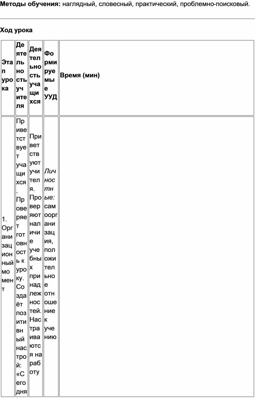 Методы обучения: наглядный, словесный, практический, проблемно‑поисковый.