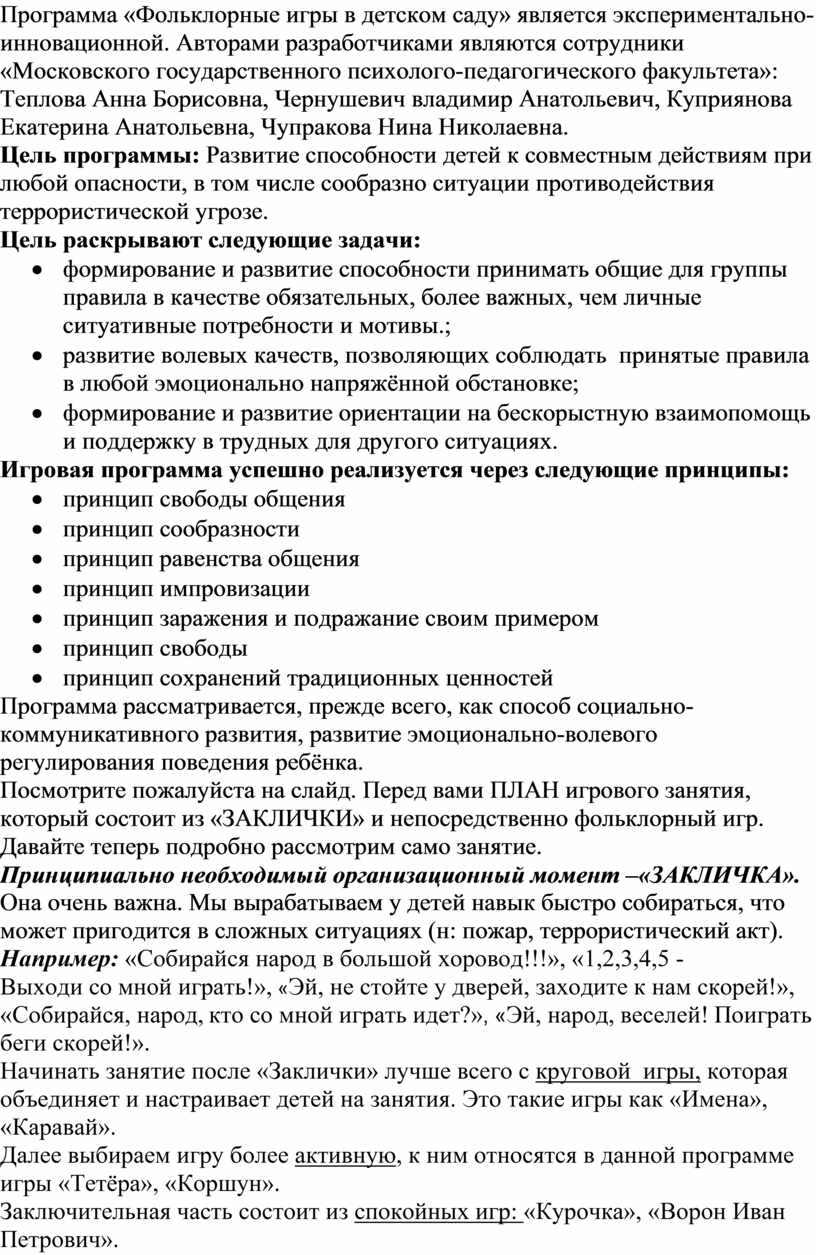 Программа «Фольклорные игры в детском саду» является экспериментально-инновационной. Авторами разработчиками являются сотрудники «Московского государственного психолого-педагогического факультета»: